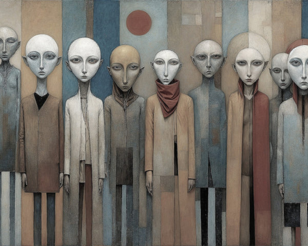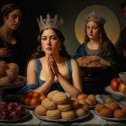 The image depicts a beautifully arranged table with elegant pastries and fruits, featuring a young woman in a blue dress, flanked by two others, creating a captivating, historical scene.