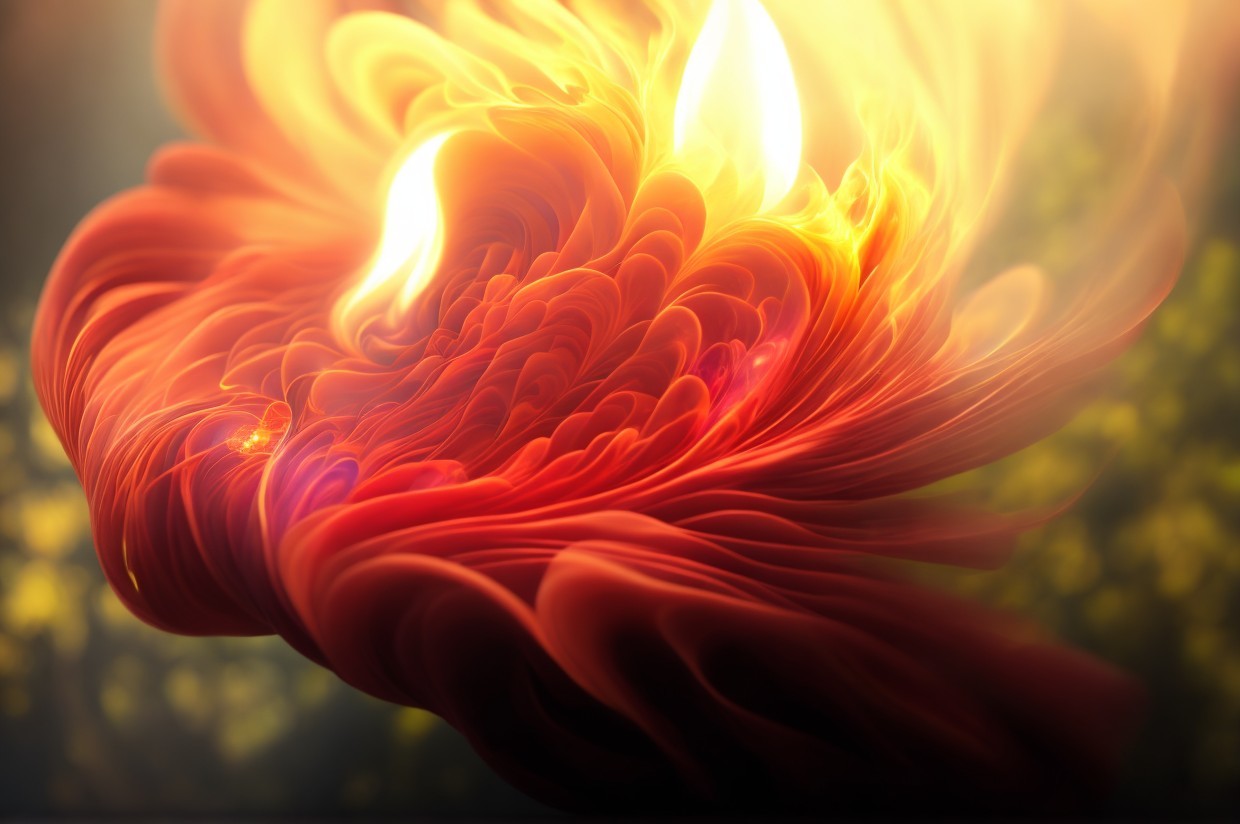A digital artwork of a swirling fire vortex with intense orange flames against a blurred forest background.