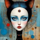 The image features a model with striking makeup, characterized by bold blue eye shadows and red lips. She has stylized hair resembling animal ears, against a vibrant blue background.