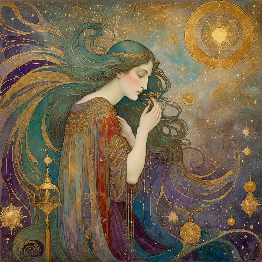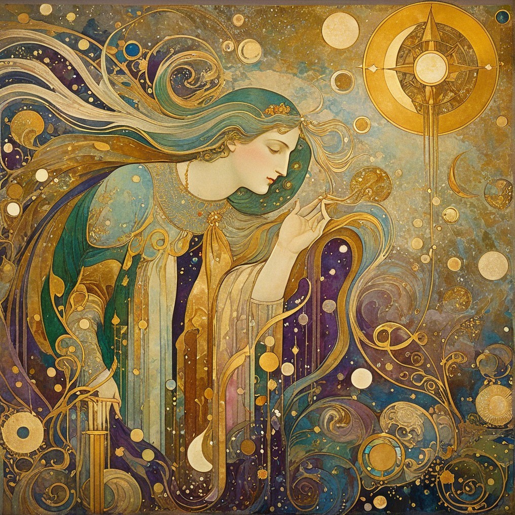 The image depicts a serene woman in a flowing purple robe, seated by a golden urn. She appears to summon bubbles amidst swirling waves, surrounded by celestial motifs and a vibrant background.
