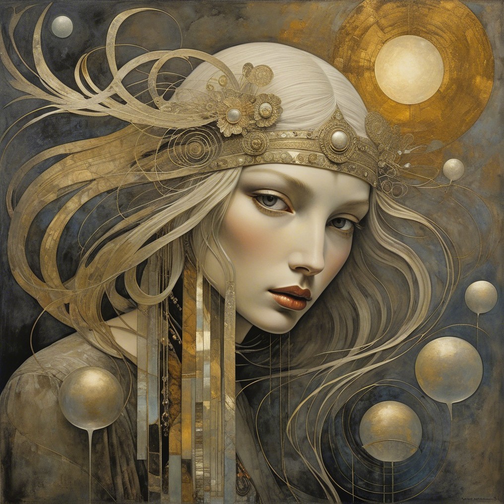 The image features a stunning, ethereal woman with flowing white hair, adorned with a golden crown and intricate jewelry. She gazes serenely against a backdrop of celestial elements, including a full moon.