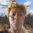 In a mystical desert setting, a vibrant figure adorned in colorful regalia stands with outstretched arms amidst glowing neon patterns, surrounded by a group of captivated children under a starry sky.