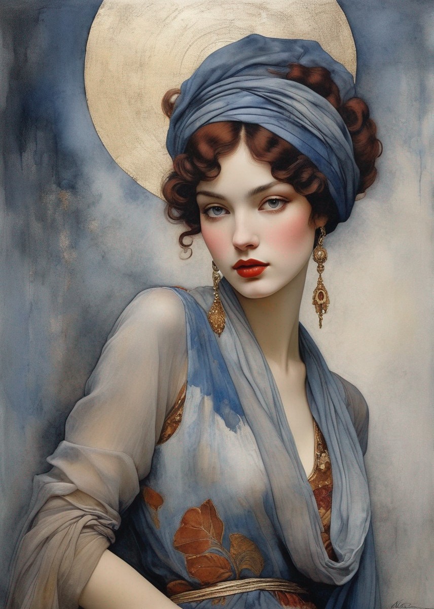 whimsical, beautiful, poignant, touching. colors rose, gold, rust, indigo, burgundy, black. soft watercolor extra water in Art Deco by Annigoni, Egon Schiele, Milo Manara, Botticelli, Catrin Welz-Stein, Jean Metzinger, Klimt, perfect eyes, perfect hands face , highly detailed, complementary colors, hyper detailed. Watercolor and ink splatter, dynamic pose,