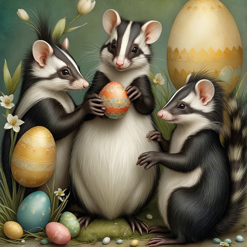 Prompt: Close up, impish mischievous gorgeous delicate family of Easter skunks with easter eggs, in the style of Alexander Jansson. by Catrin Welz-Stein, Michael Parkes. By Aubrey Beardsley and Arthur Rackham . .
