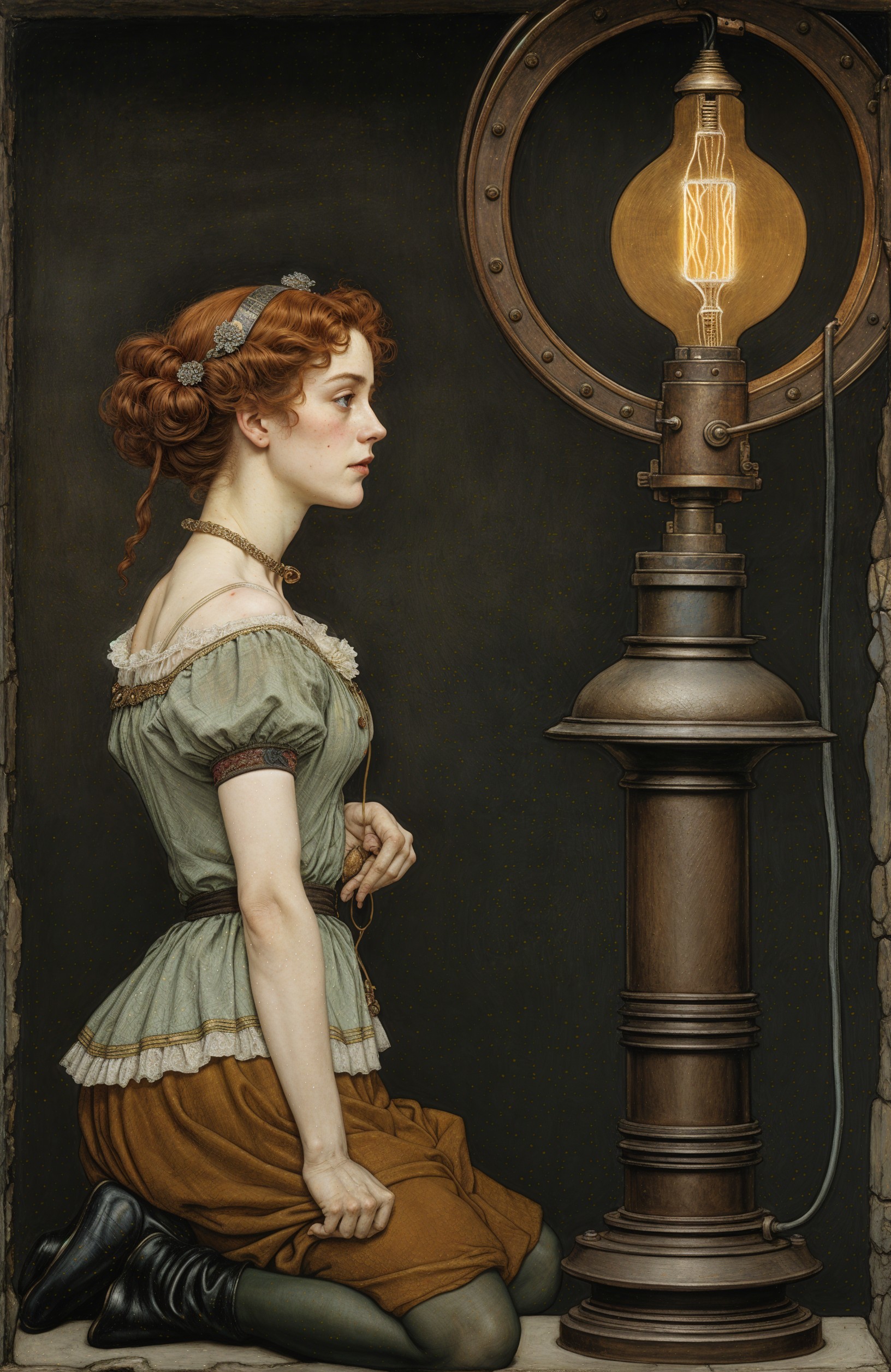 The image features a profile of a woman with red hair, dressed in a detailed gown. Beside her are smaller scenes of women engaged in various activities, evoking a sense of storytelling and elegance.