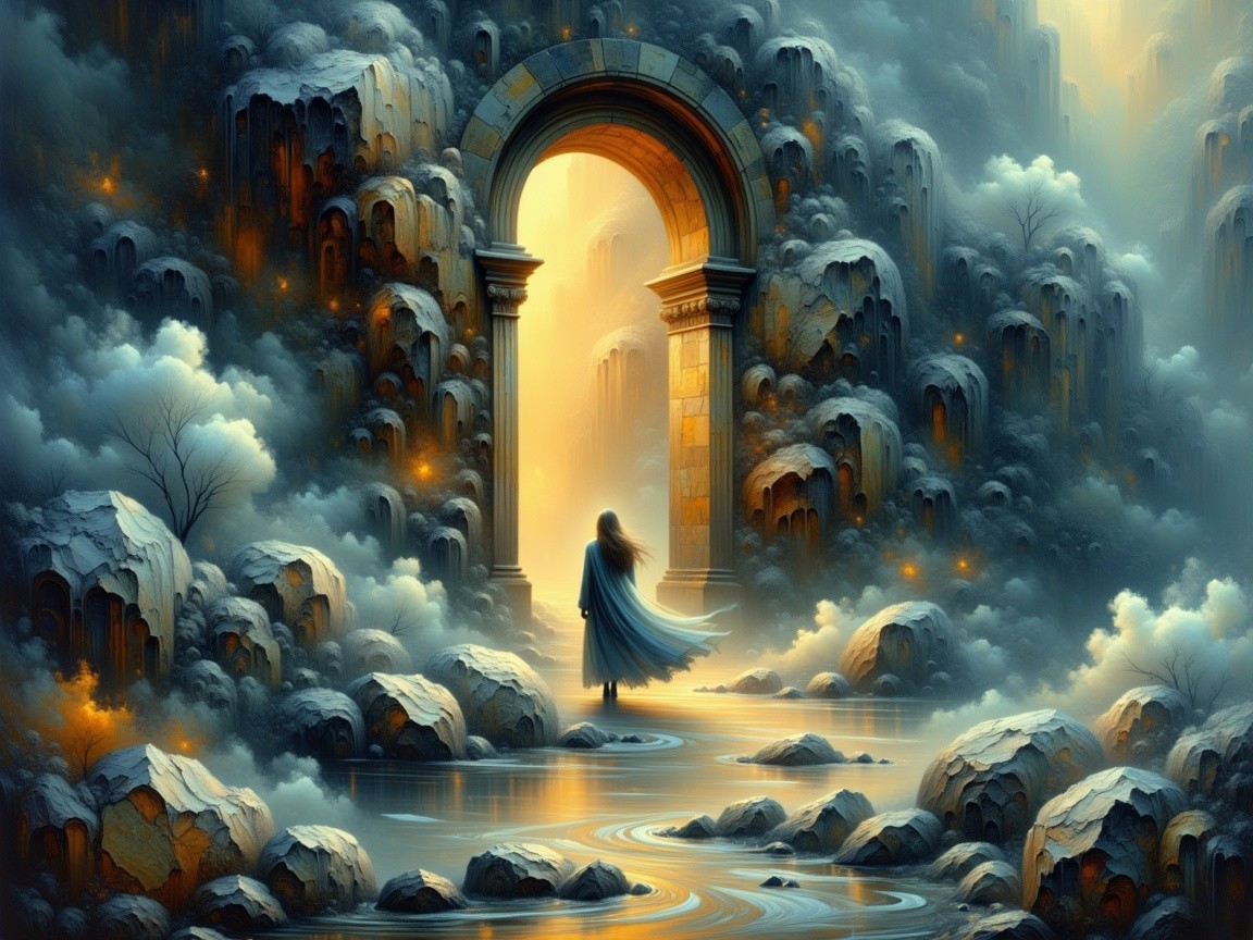 A mystical landscape features a glowing archway surrounded by icy rocks and ethereal mist. A figure in a flowing cloak walks toward the light, evoking a sense of wonder and adventure.