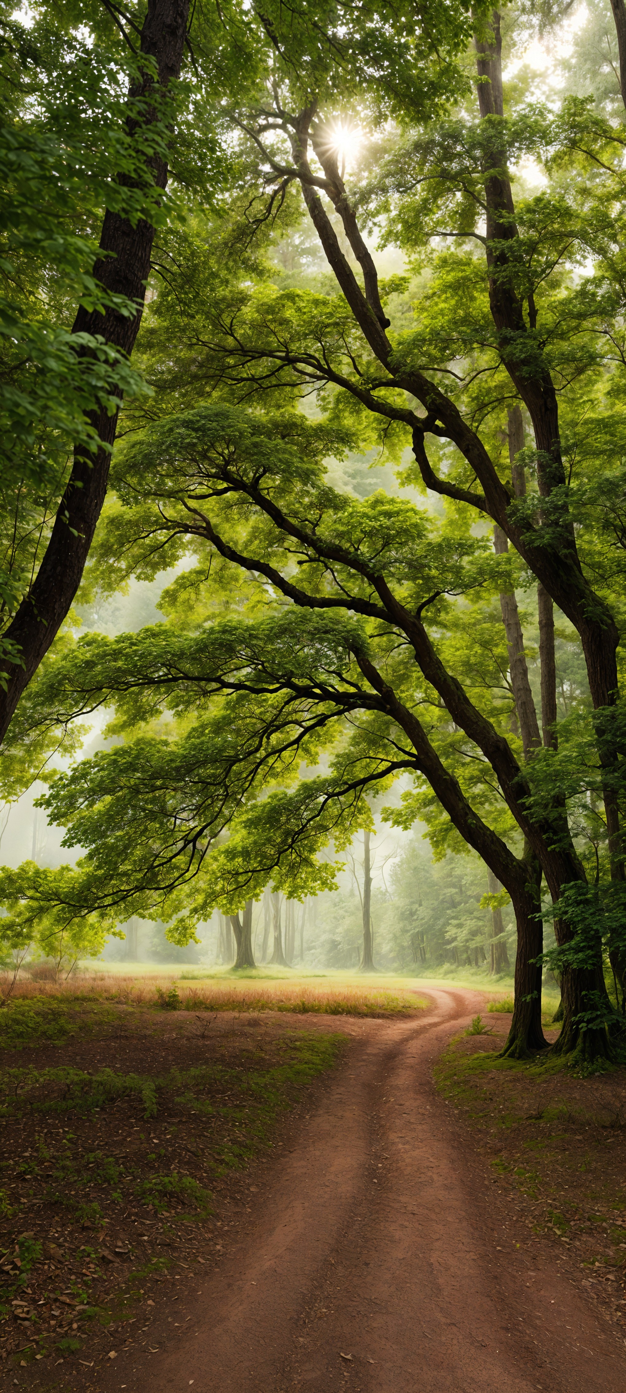 Tall trees with a mix of green and pink blossoms line a path covered in pink petals, creating a beautiful and serene natural tunnel.
