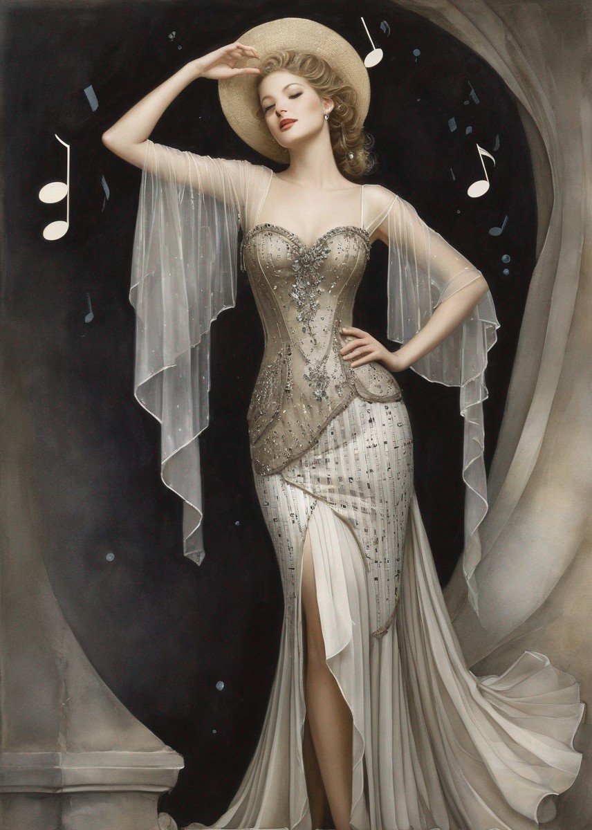 An elegant woman in a musical-themed dress striking a pose with closed eyes, surrounded by floating music notes and a large note background.