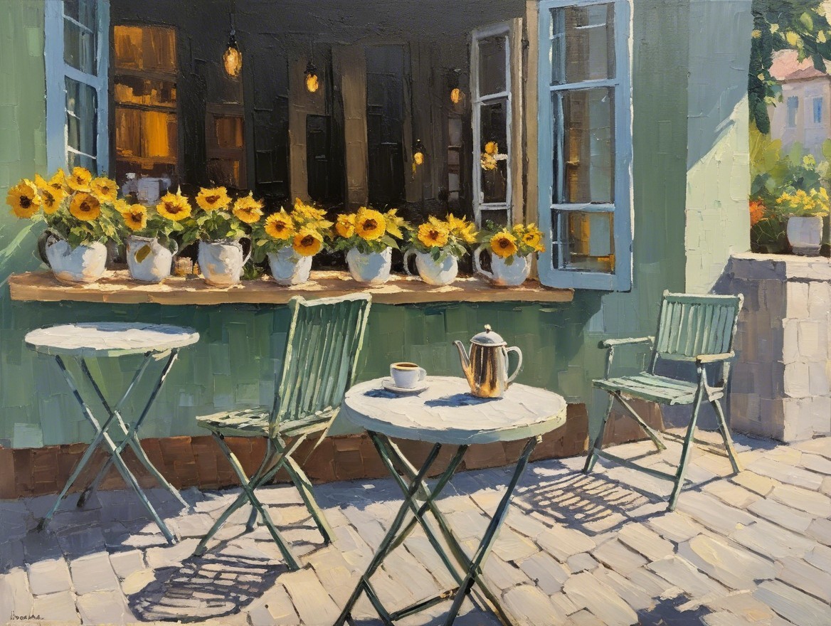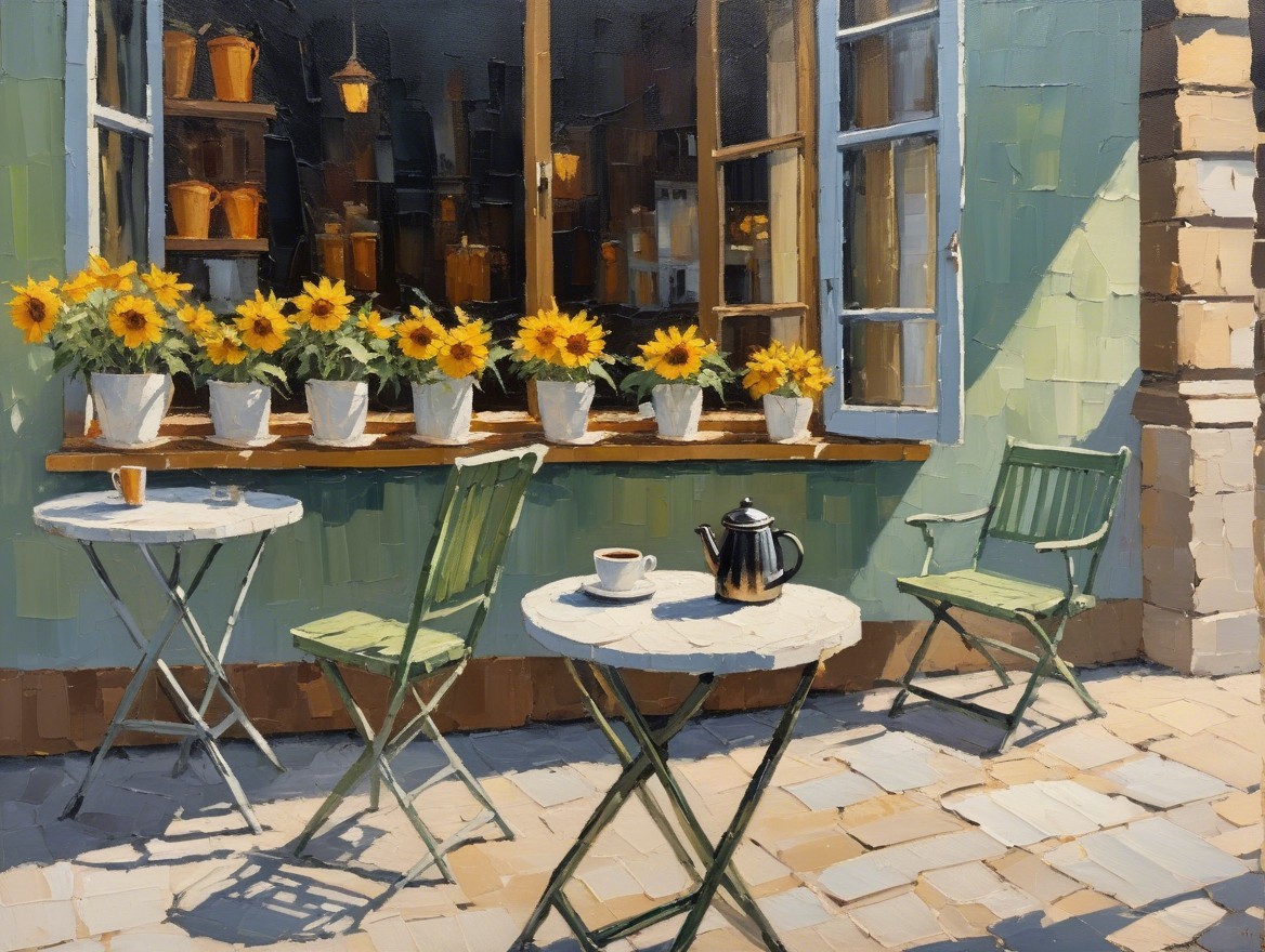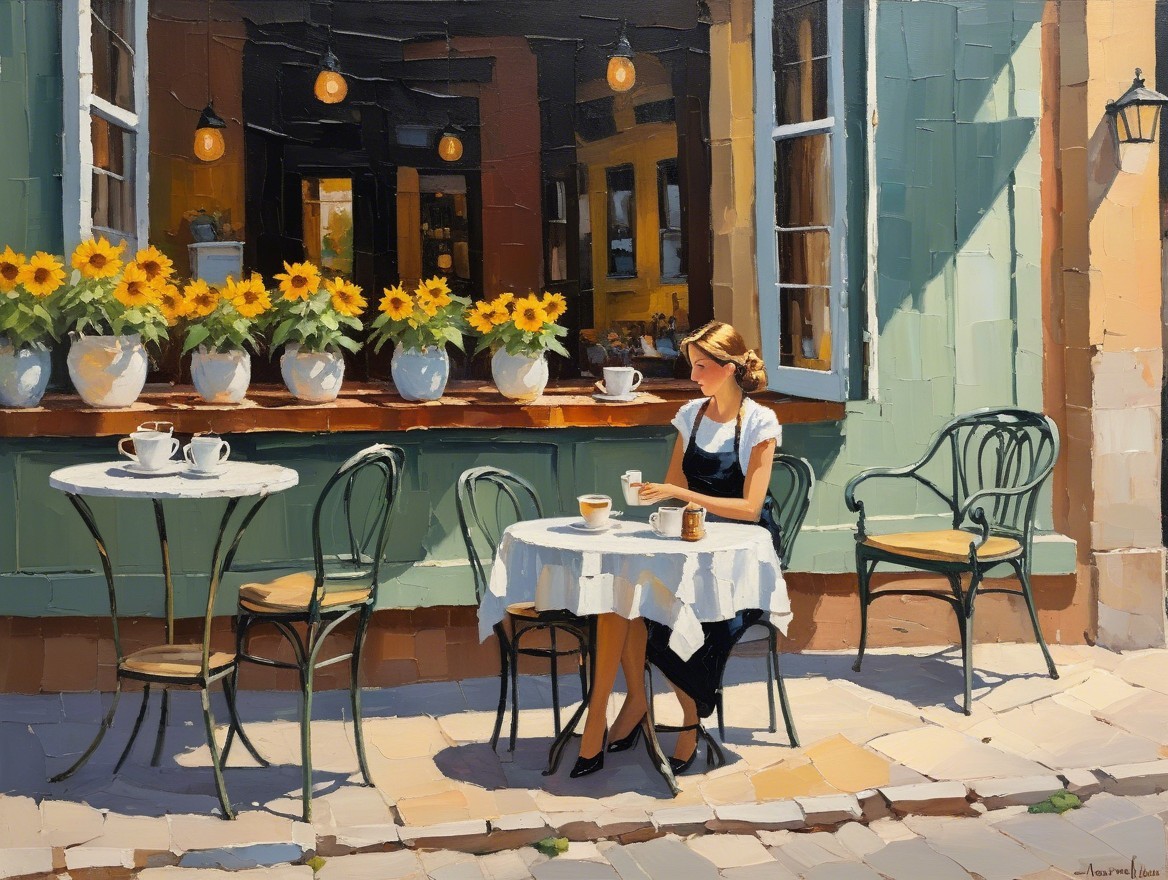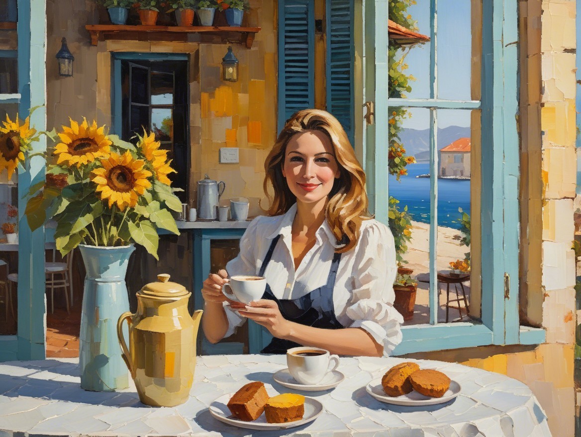 A cheerful woman sits at a sunlit table adorned with cookies and a vibrant sunflower arrangement, sipping coffee by an open window overlooking a picturesque seaside view.