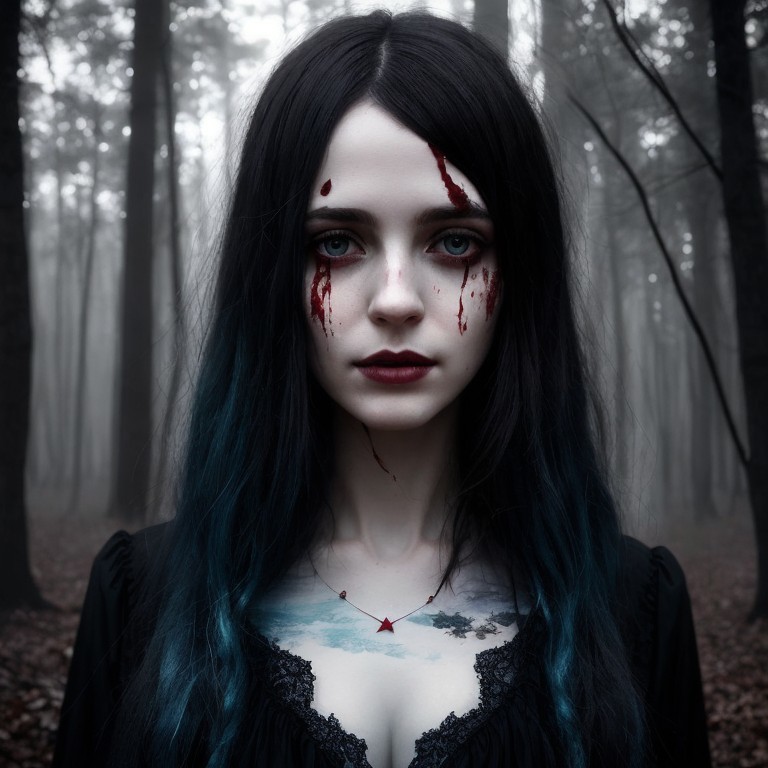 A woman with dark hair and flowers stands in a misty forest; her face is adorned with striking makeup and petals.