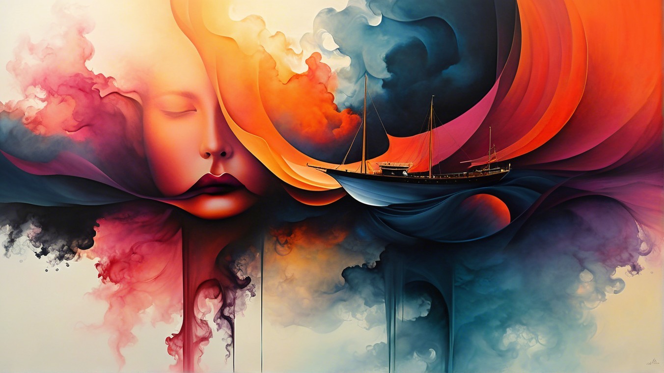 Richly textured pastel ink and charcoal line art, mystical, magical, surreal Mandelbrot fractal: Her gaze, a tempest, fierce and bright, draws sailors into endless night. With lips like wine, both sweet and bold, A kiss of fire, a taste of cold. by Susanne, misty atmosphere, sailing ships on turbulent waves, cliffs, soft focus sky, glowing sparks, dynamic gold leaf splatter, iridescent, powdery pastel colours, reflections.