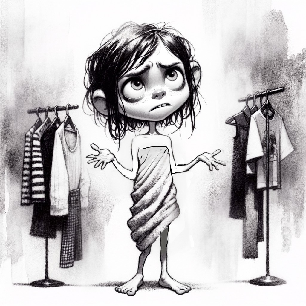 Nothing to wear. A cartoon girl choosing outfits is a dissatisfied, skinny, disheveled, shaggy, with thin legs in a towel with wet hair after a shower. Caricature. In the style of a child's drawing. Minimalism, simplicity, naive, charcoal drawing, whirlwind of colors, gray soot, sketching, bleached background, grunge, alcohol ink, play of light and shadow, quick sketch, unusual horror, watercolor, dark art