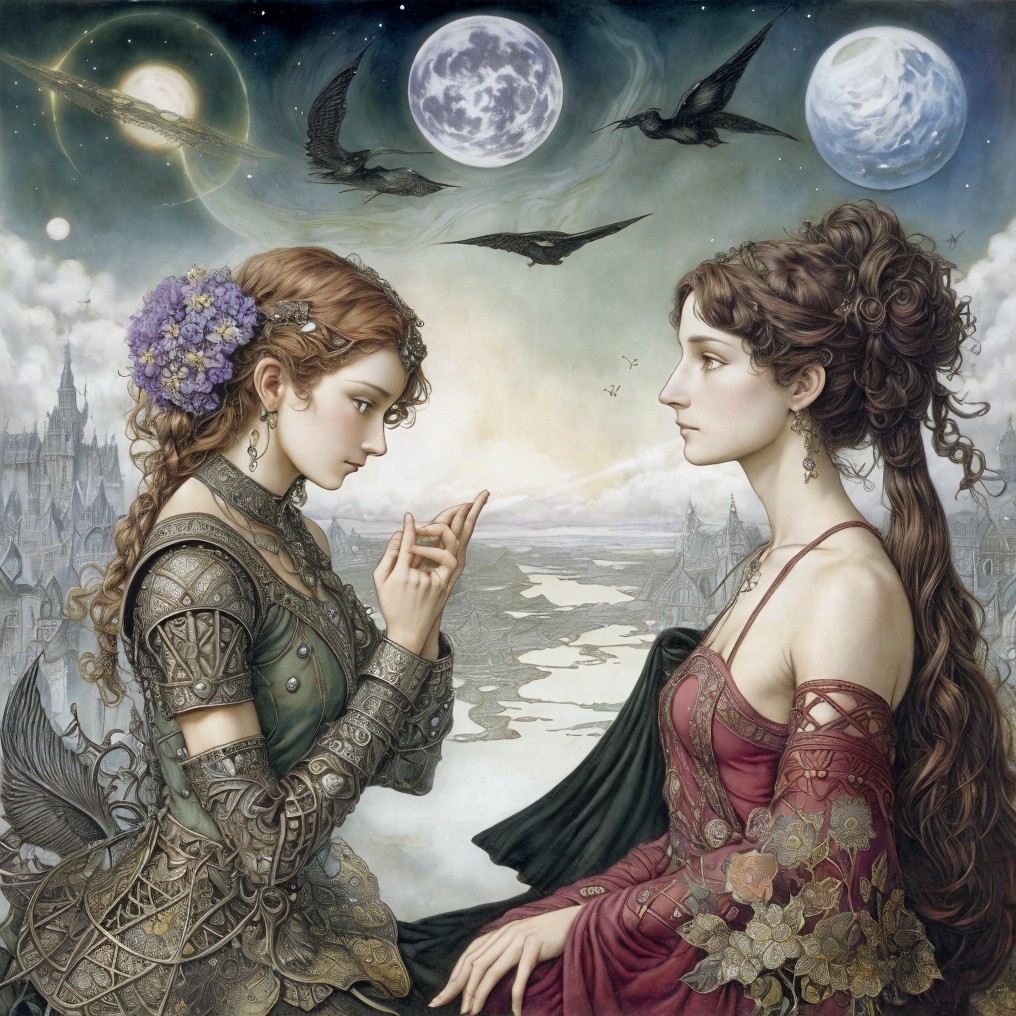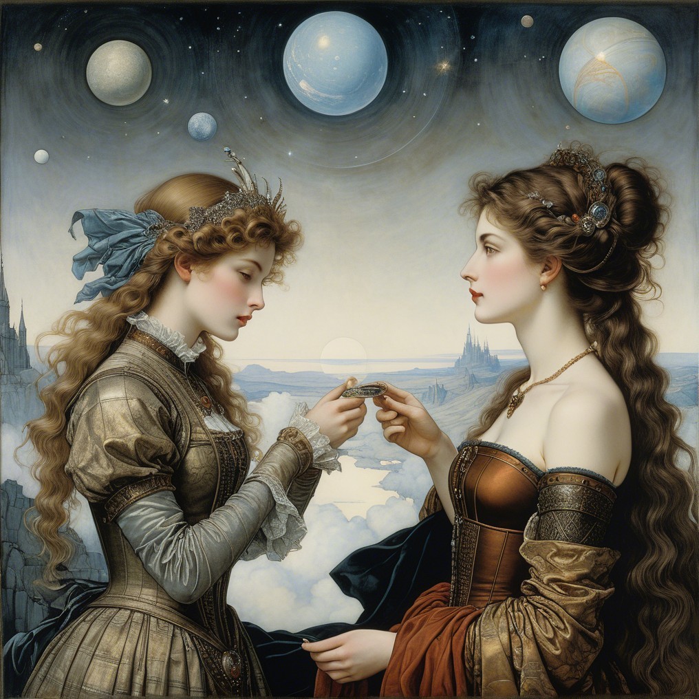 The image features two elegantly dressed women, each representing different celestial bodies. They stand facing each other, surrounded by a cosmic backdrop of stars and planets, symbolizing harmony.