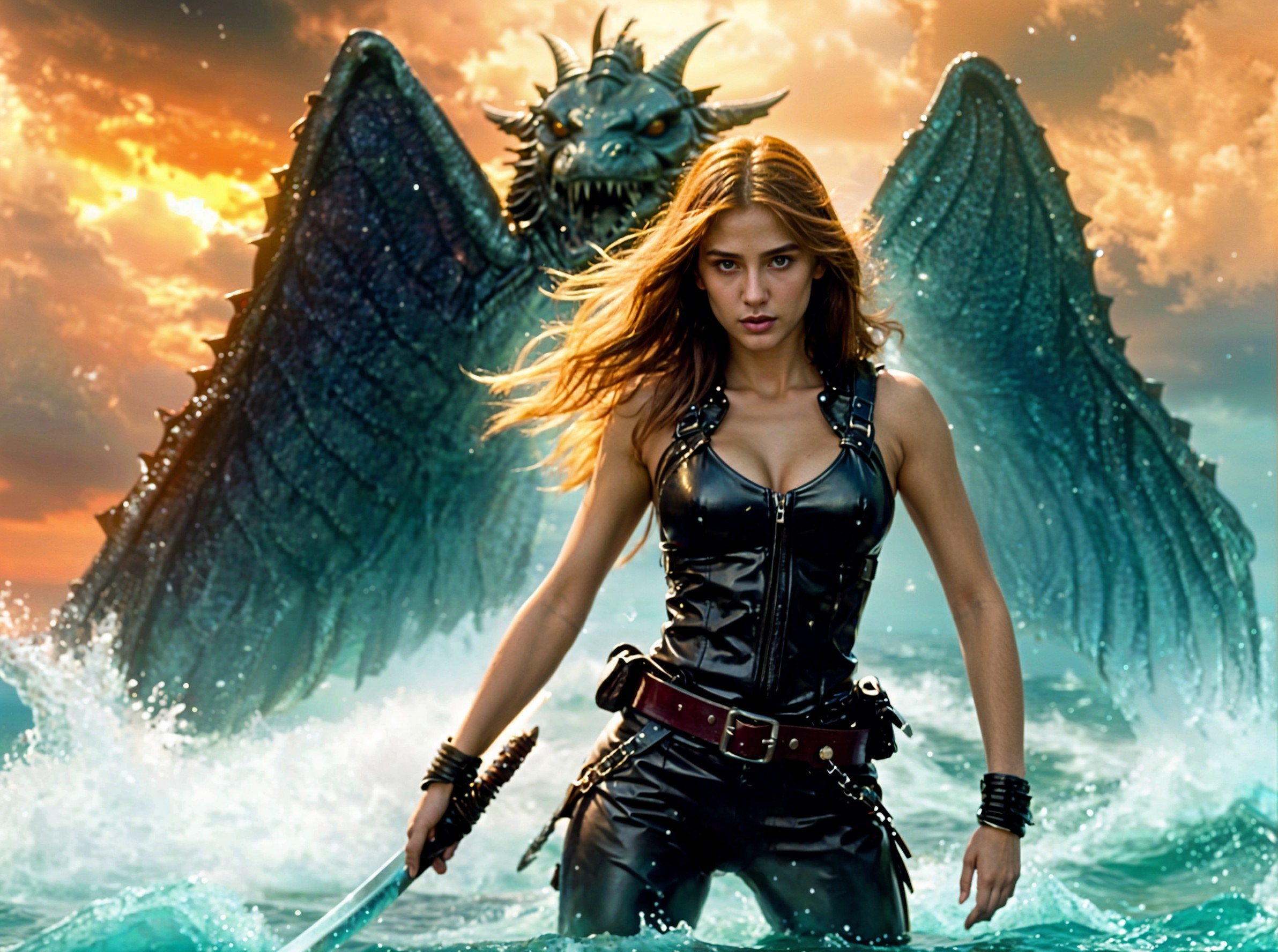 A fierce warrior in a black leather outfit stands confidently in the water, wielding a sword. Behind her, a menacing dragon emerges against a dramatic sunset sky.