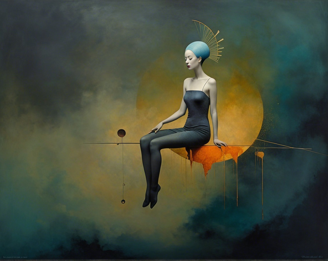 A surreal scene featuring a woman with a striking blue headdress, perched on a thin structure against a backdrop of a large orange circle and a crescent moon, set in a dreamlike atmosphere.