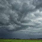 A dramatic, monochromatic landscape features heavy, swirling clouds dominating the sky. In the foreground, a small farmhouse and a tree stand amidst vast fields, hinting at an impending storm.