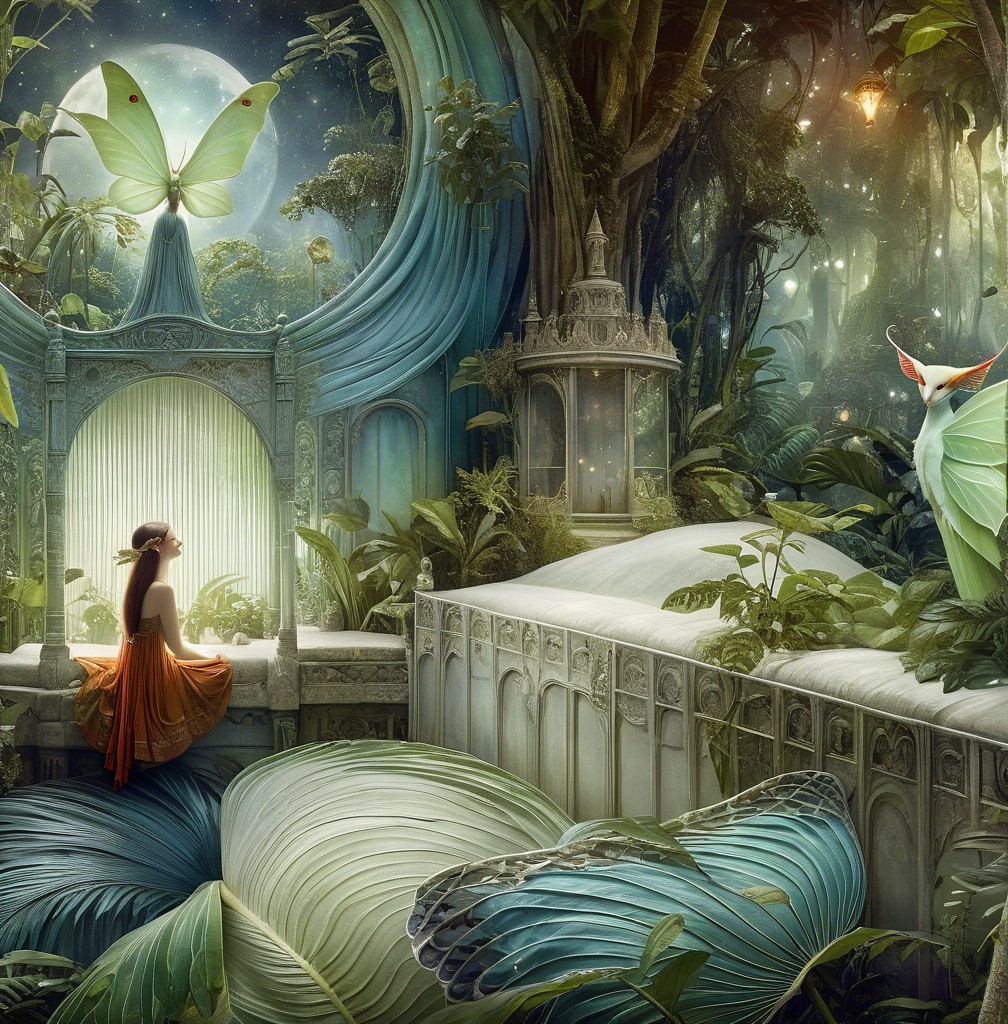 Close up, ghostly amused beautiful Amazonian Luna moth goddess in a jungle dreamscape in the style of Alexander Jansson. by Catrin Welz-Stein, Michael Parkes