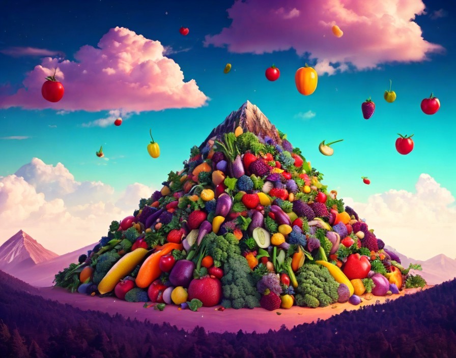 A colorful mountain of fruits and vegetables under a sky with hot air balloons and fluffy clouds at sunrise or sunset.