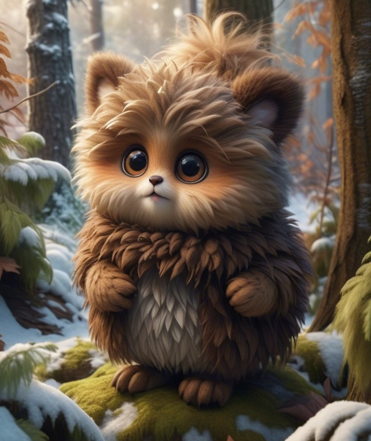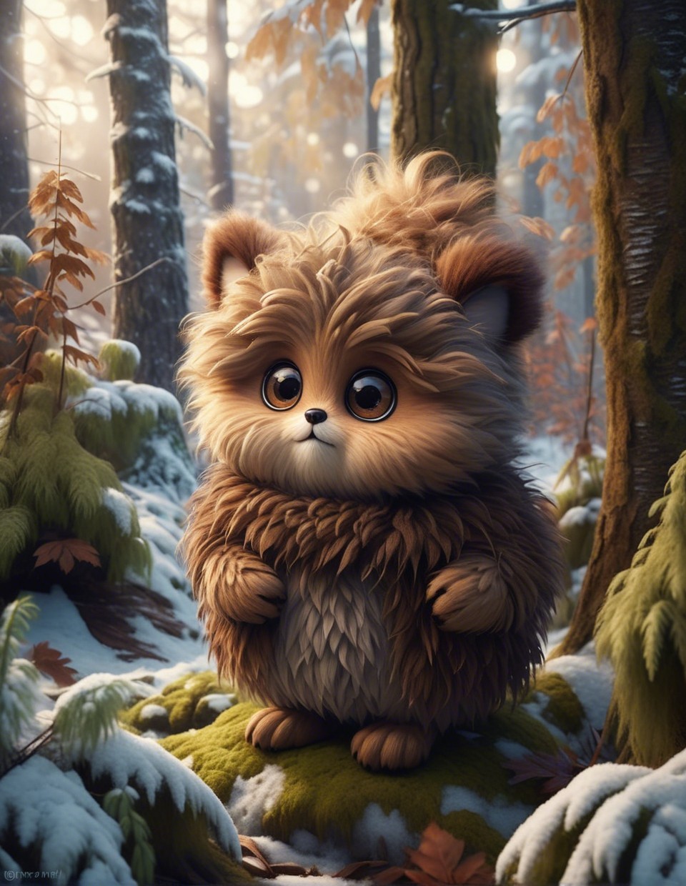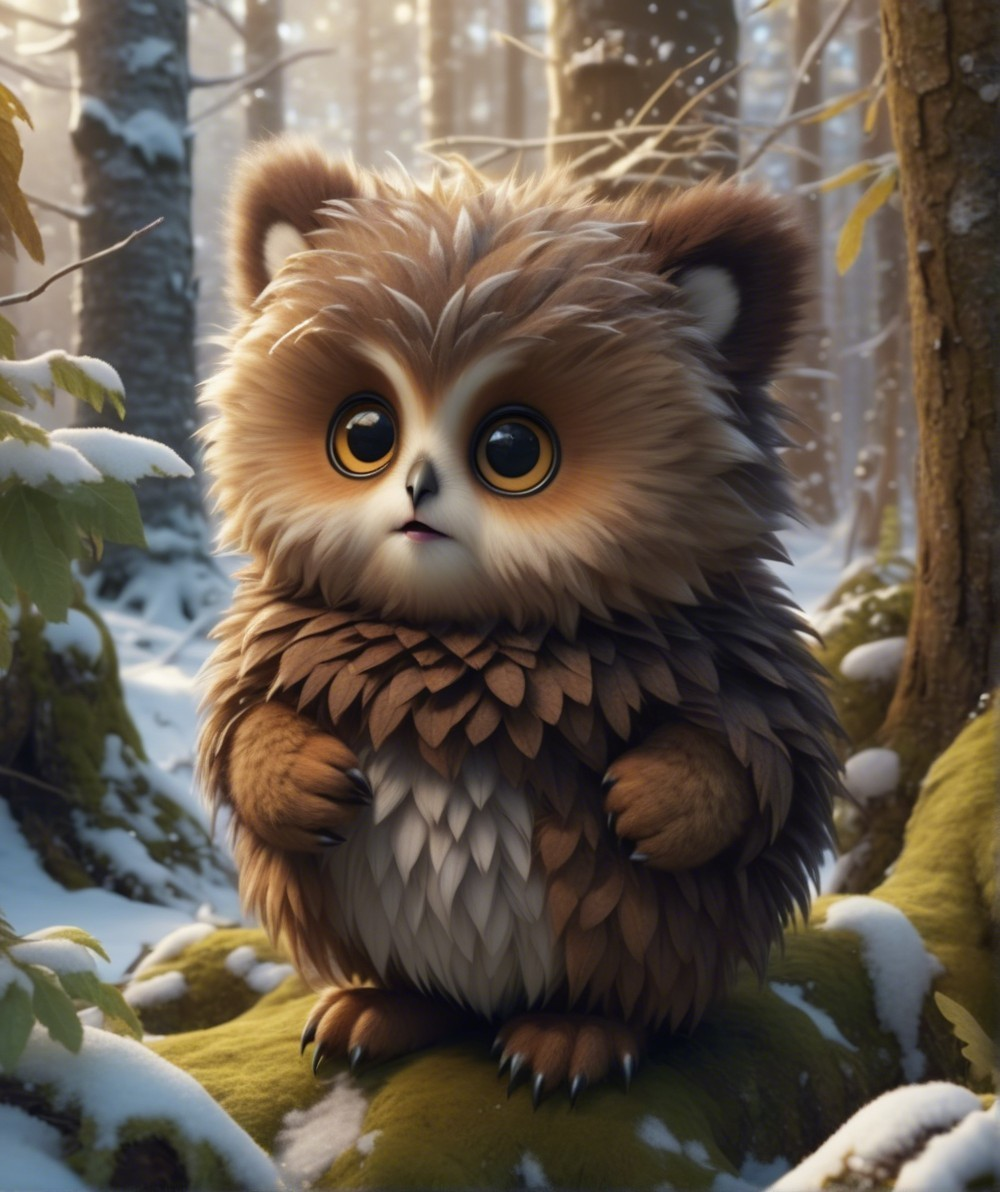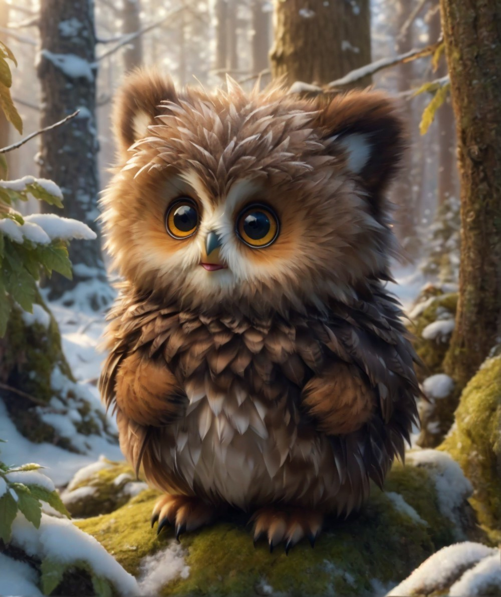 A cute, fluffy owlbear with big, expressive eyes stands adorably on a mossy log, surrounded by a serene winter forest covered in soft snow and tall, green trees.