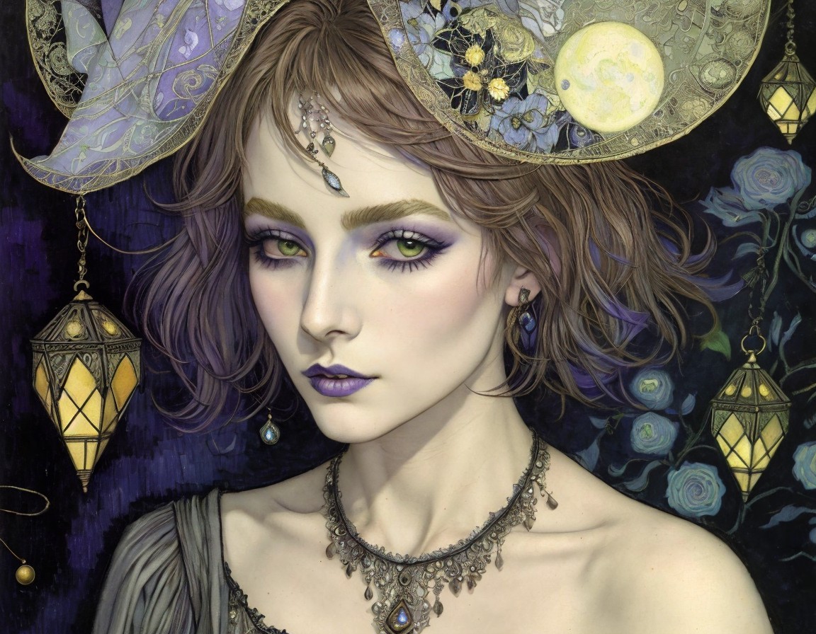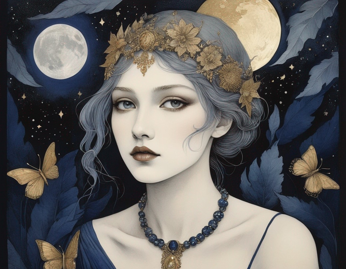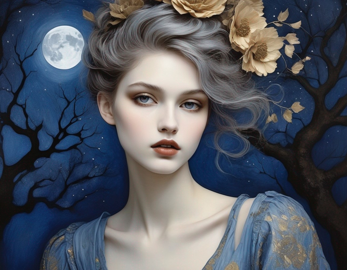 A woman in a starry dress dances under a moonlit, autumnal tree canopy, evoking a dreamy, enchanting night scene.