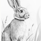 A detailed black-and-white illustration of a rabbit sitting in tall grass, showcasing its expressive eyes and perked ears, highlighting the natural elegance of this gentle creature.