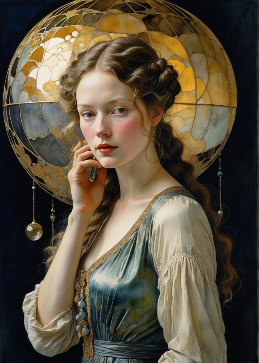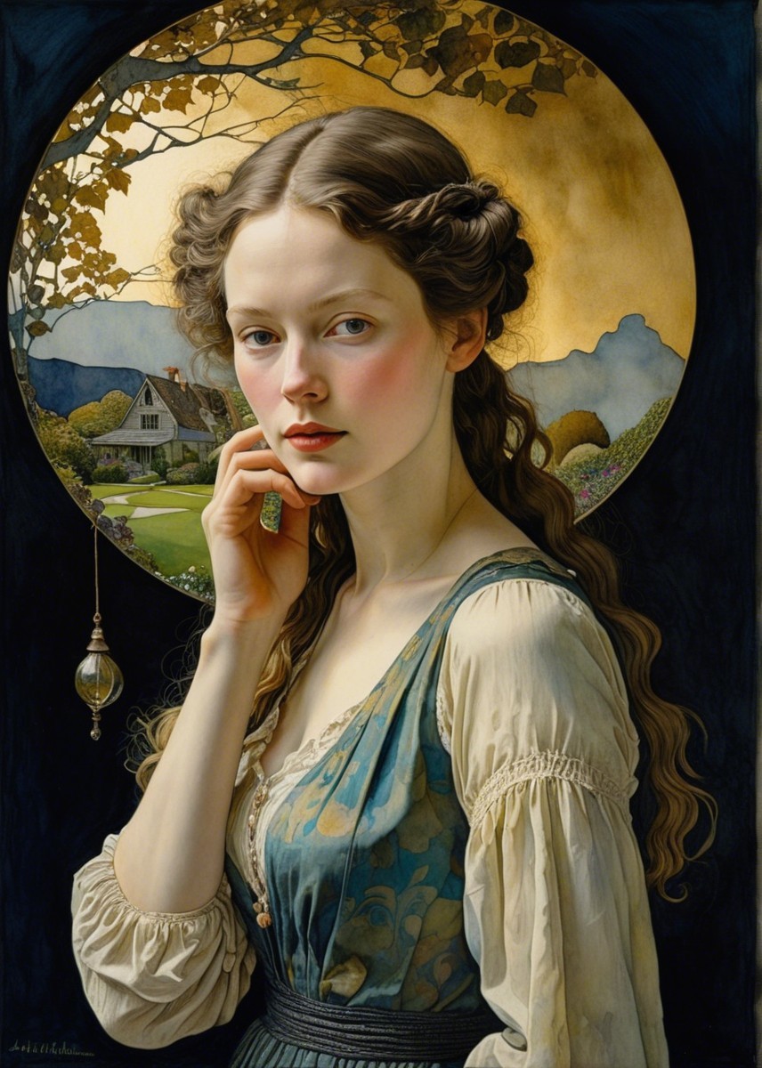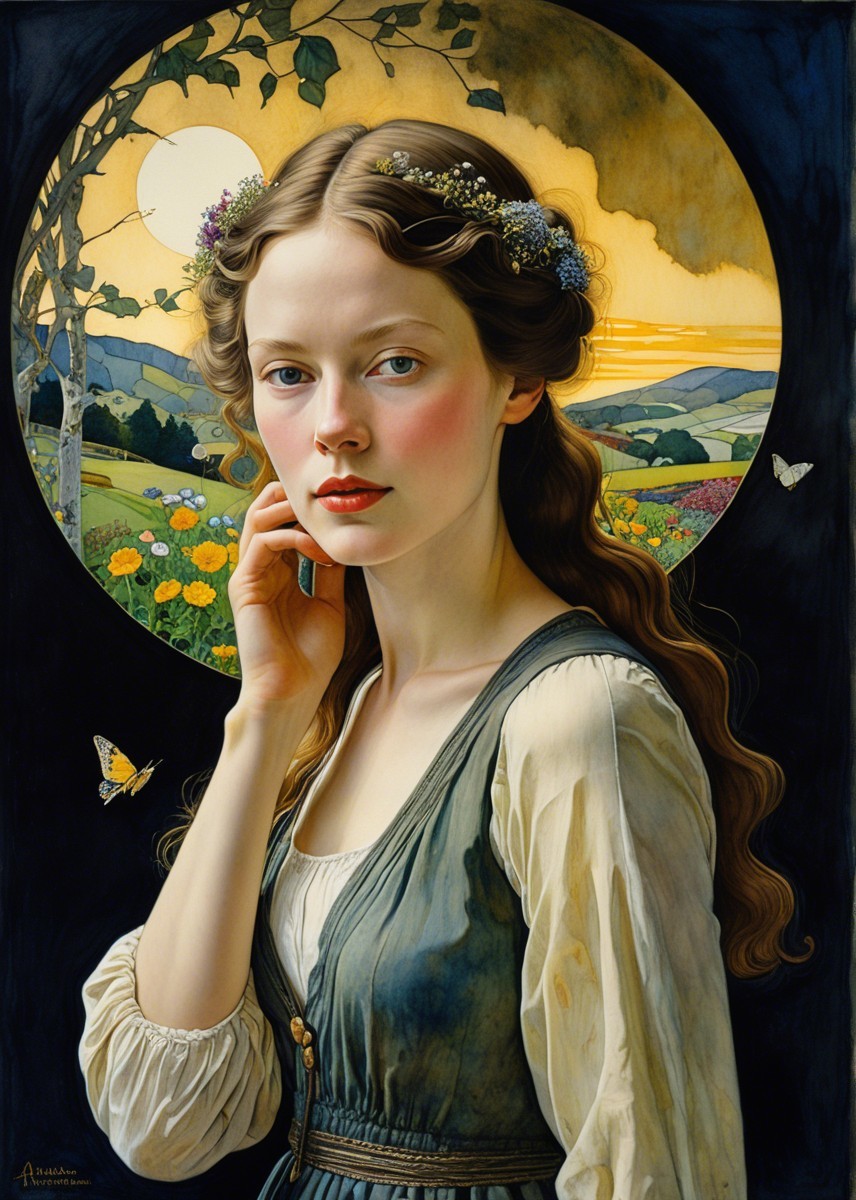 A young woman with flowing hair adorned with flowers gazes thoughtfully, framed by a picturesque moonlit landscape and vibrant fields, evoking a sense of serenity and connection to nature.