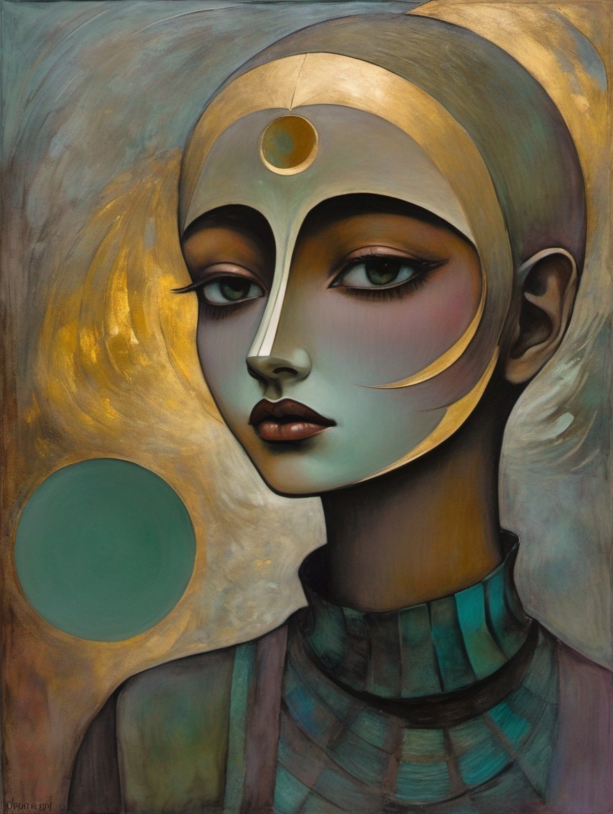 A portrait of a woman with stylized makeup, a crescent moon headpiece, and an earring, set against an abstract backdrop.