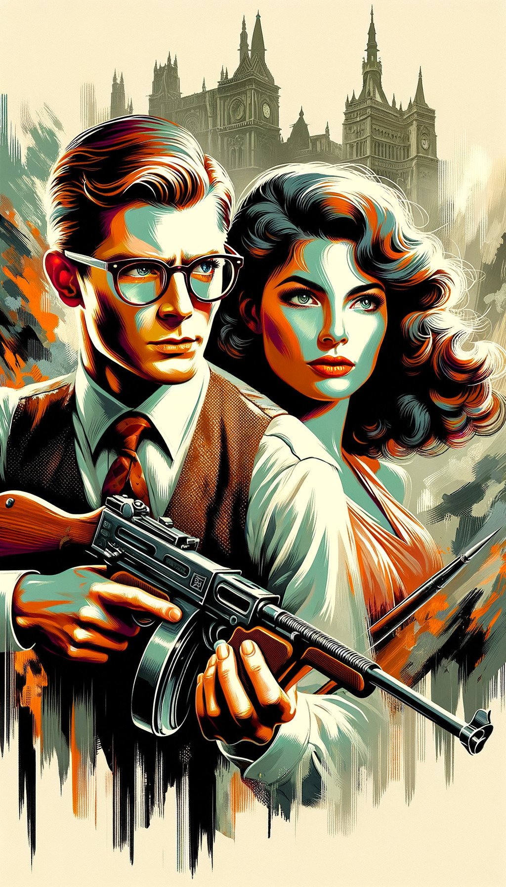 Prompt: "Dynamic duo, retro poster design, vintage submachine gun, determined young man, big glasses, striking woman portrait, dramatic features, captivating eyes, strength and charm, abstract background, bold colors, brush strokes, ac