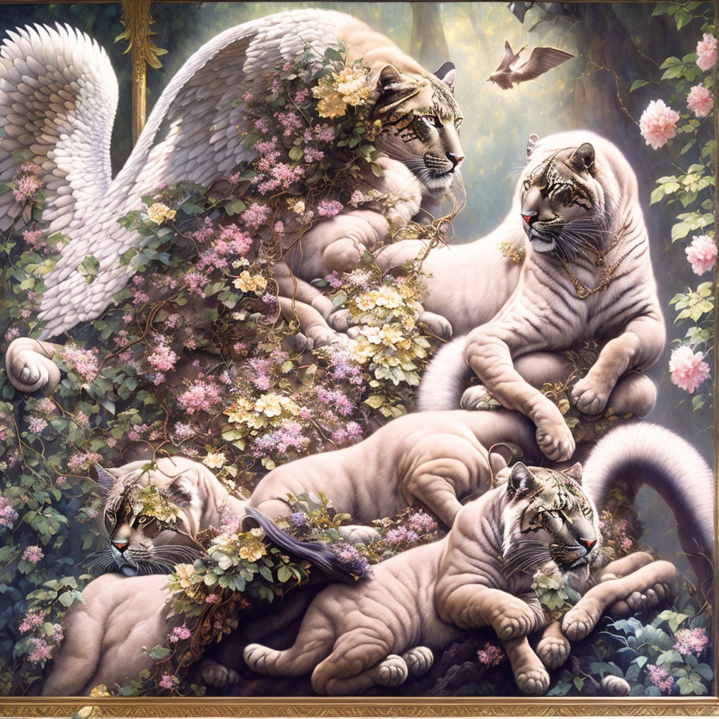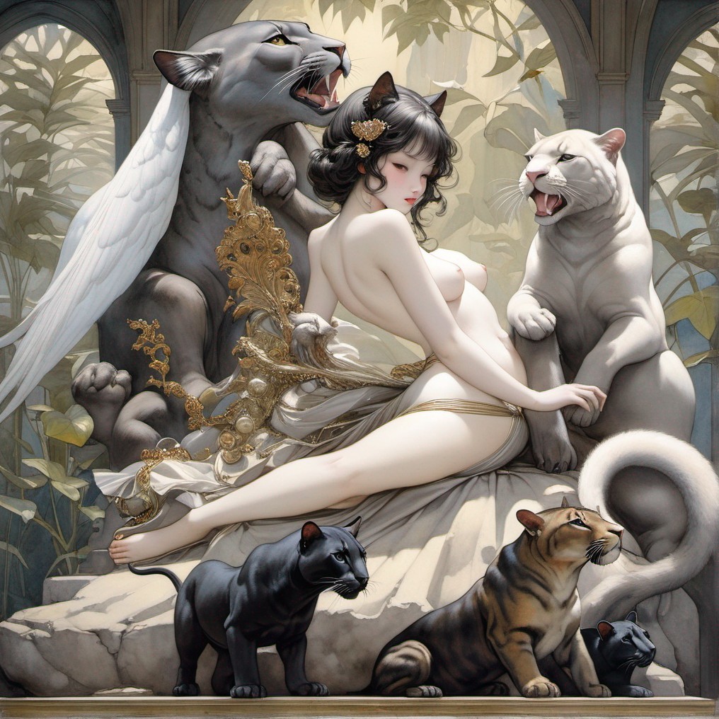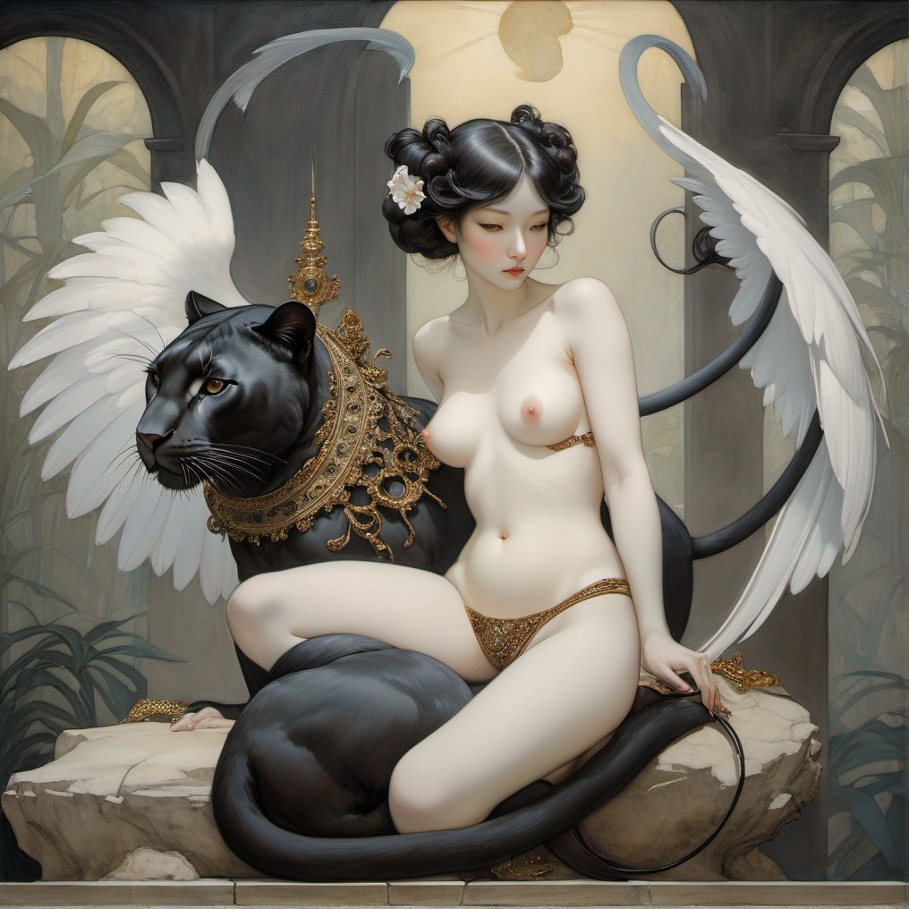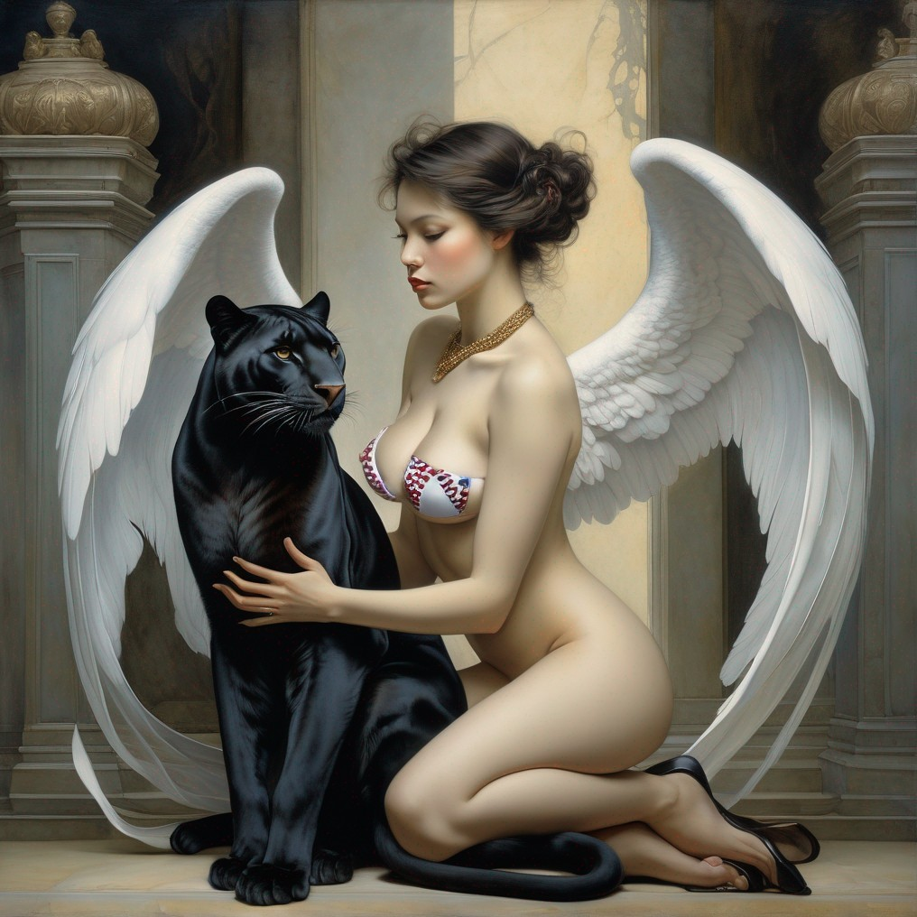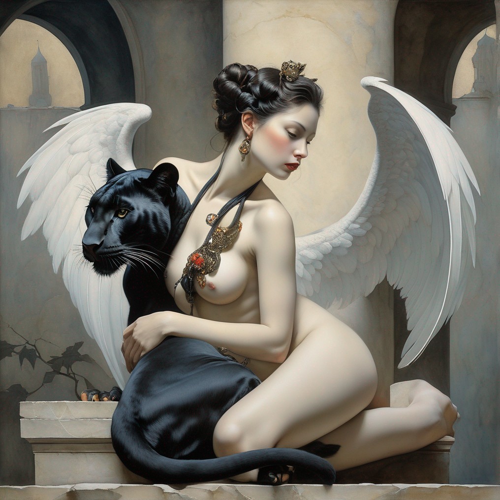 A fantasy artwork featuring a winged woman with an ethereal look seated beside a black panther, set against a classical architecture backdrop.