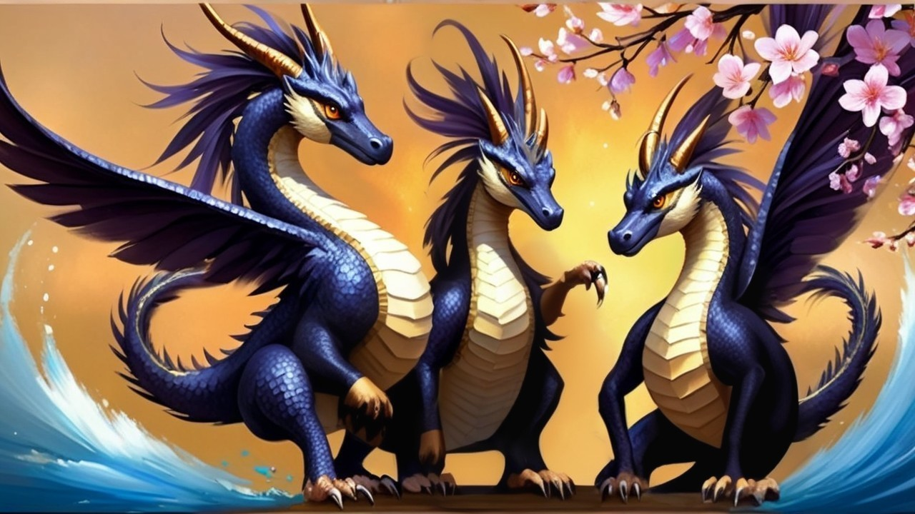Three majestic blue dragons with striking purple manes stand together against a warm background. Their wings are spread wide, surrounded by cherry blossoms and gentle waves.