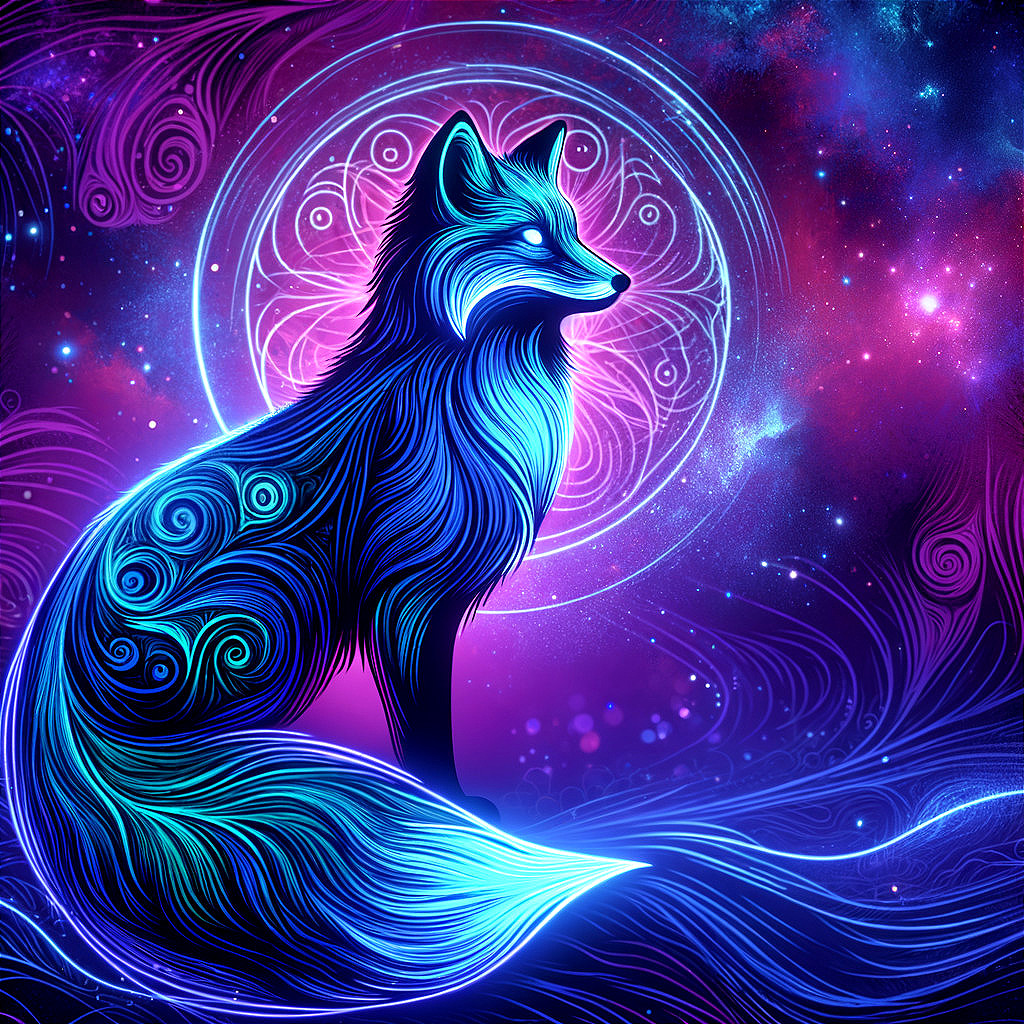 A vibrant, glowing fox sits against a cosmic backdrop, with swirling patterns and colors of blue, purple, and pink, creating a mystical and ethereal atmosphere.