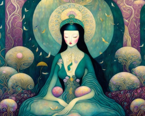 A serene landscape features colorful, stylized mountains and a tranquil lake. Peaceful Buddha figures sit meditating, surrounded by lush trees and gentle pastel hues, evoking a sense of harmony.