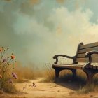 A charming vintage doll dressed in a floral-embroidered beige dress sits on a wooden bench, with a small shoe nearby, surrounded by lush greenery and wildflowers in the background.