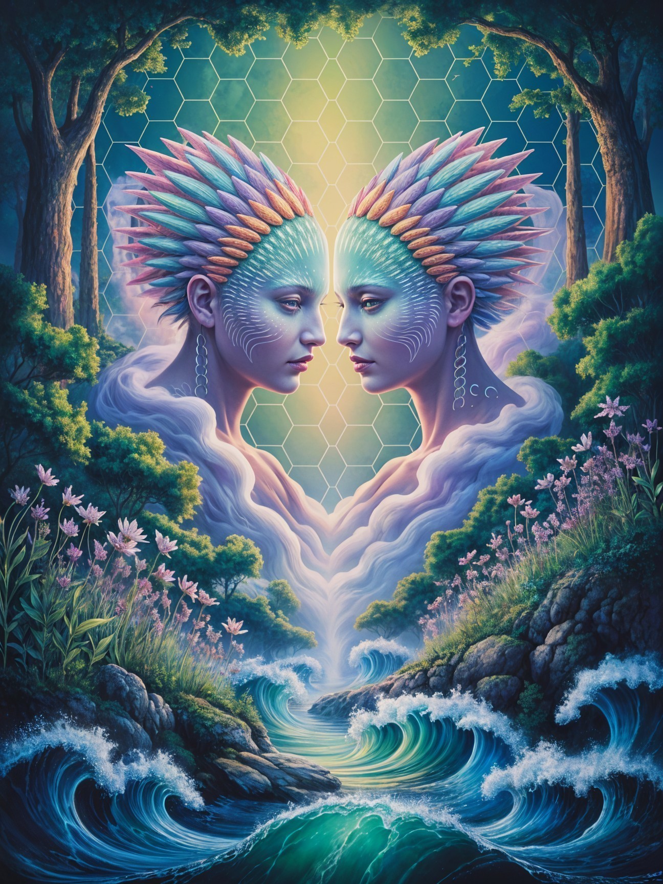 The image features two stylized figures with colorful headdresses, facing each other amidst a vibrant, mystical landscape, with lush trees, blooming flowers, and dynamic waves.