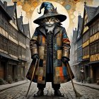 A whimsical black cat in a witch’s hat and ornate coat adorned with pumpkins stands confidently on a cobblestone street, with a smaller black cat beside it, surrounded by a festive Halloween backdrop.