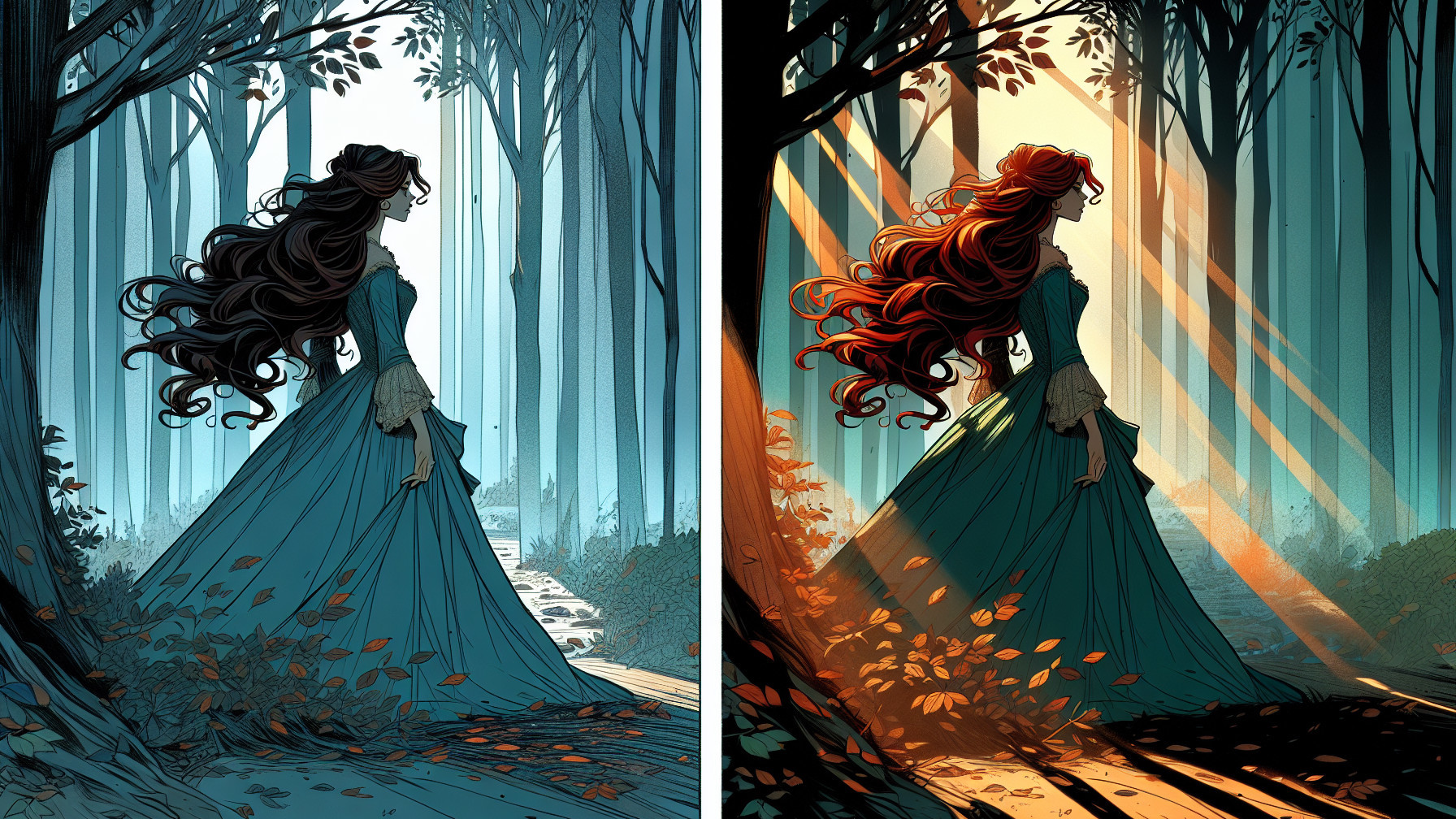 A silhouette of a woman in a flowing blue dress stands in a forest, surrounded by tall trees. The scene contrasts two moods: one in cool blues and the other in warm golden tones, capturing a magical atmosphere.