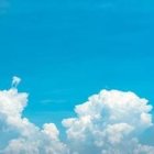 A serene seascape features a large ship nestled among fluffy white clouds against a vibrant blue sky. A smaller sailboat drifts nearby, creating a tranquil and dreamy atmosphere.