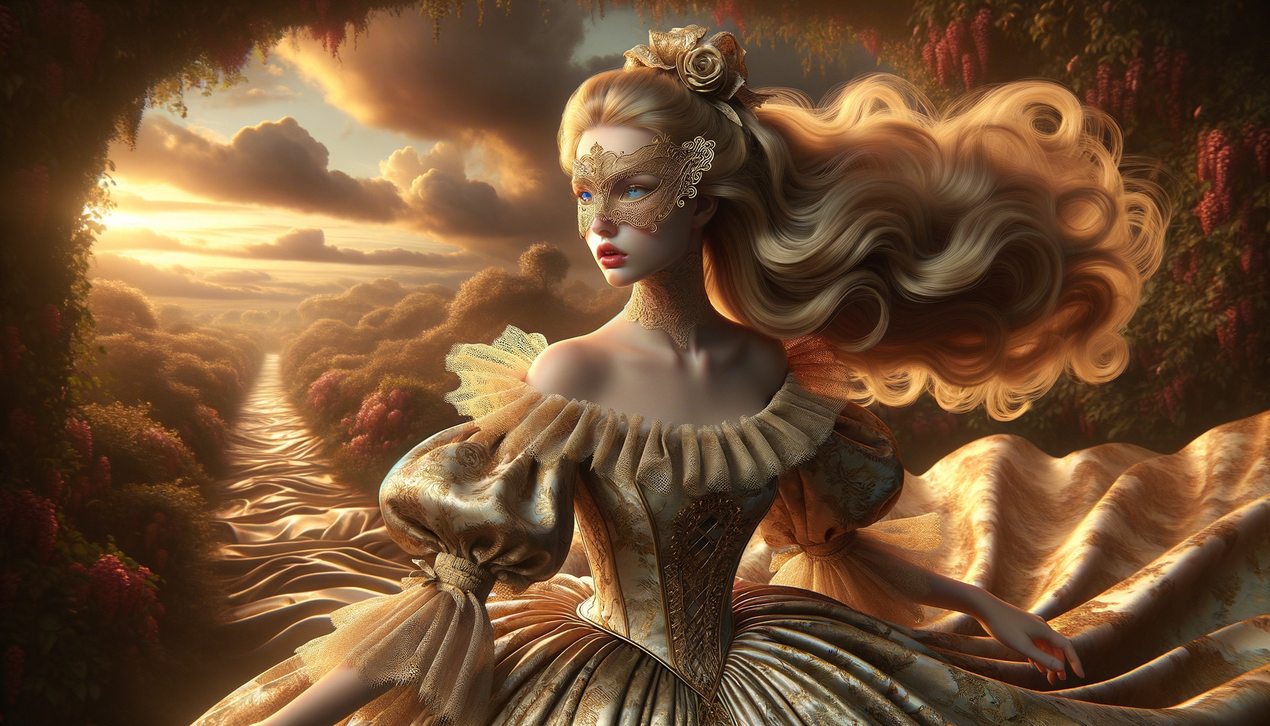 An elegant woman in a golden vintage dress and mask with flowing hair against a sunset-lit forest pathway.