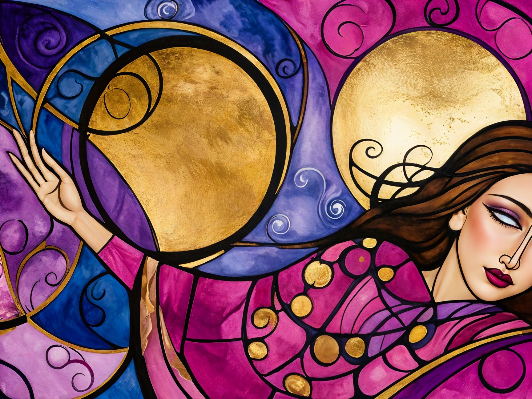 A vibrant, colorful artwork featuring a serene woman with flowing hair. She is surrounded by swirling patterns in pink, gold, and blue, evoking a dreamy and mystical atmosphere. original Prompt: Manja