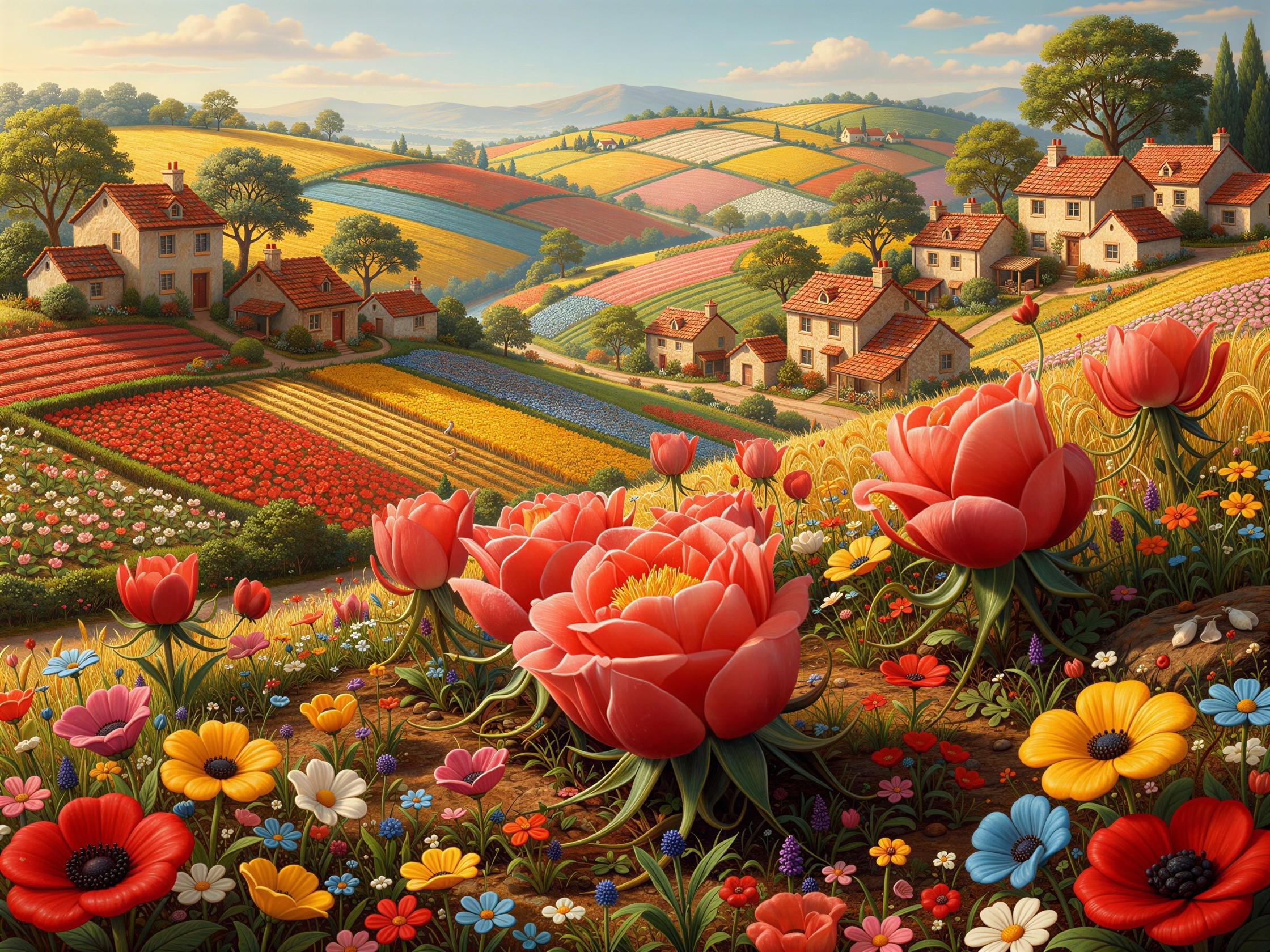 An overhead longshot of a highly detailed, colorful, vibrant, picturesque, photorealistic painting of a landscape in the Tuscan countryside in Italy, with a foreground of a garden full of large, plump, red, yellow, and blue flowers, a mid-ground of an old village with many houses with
