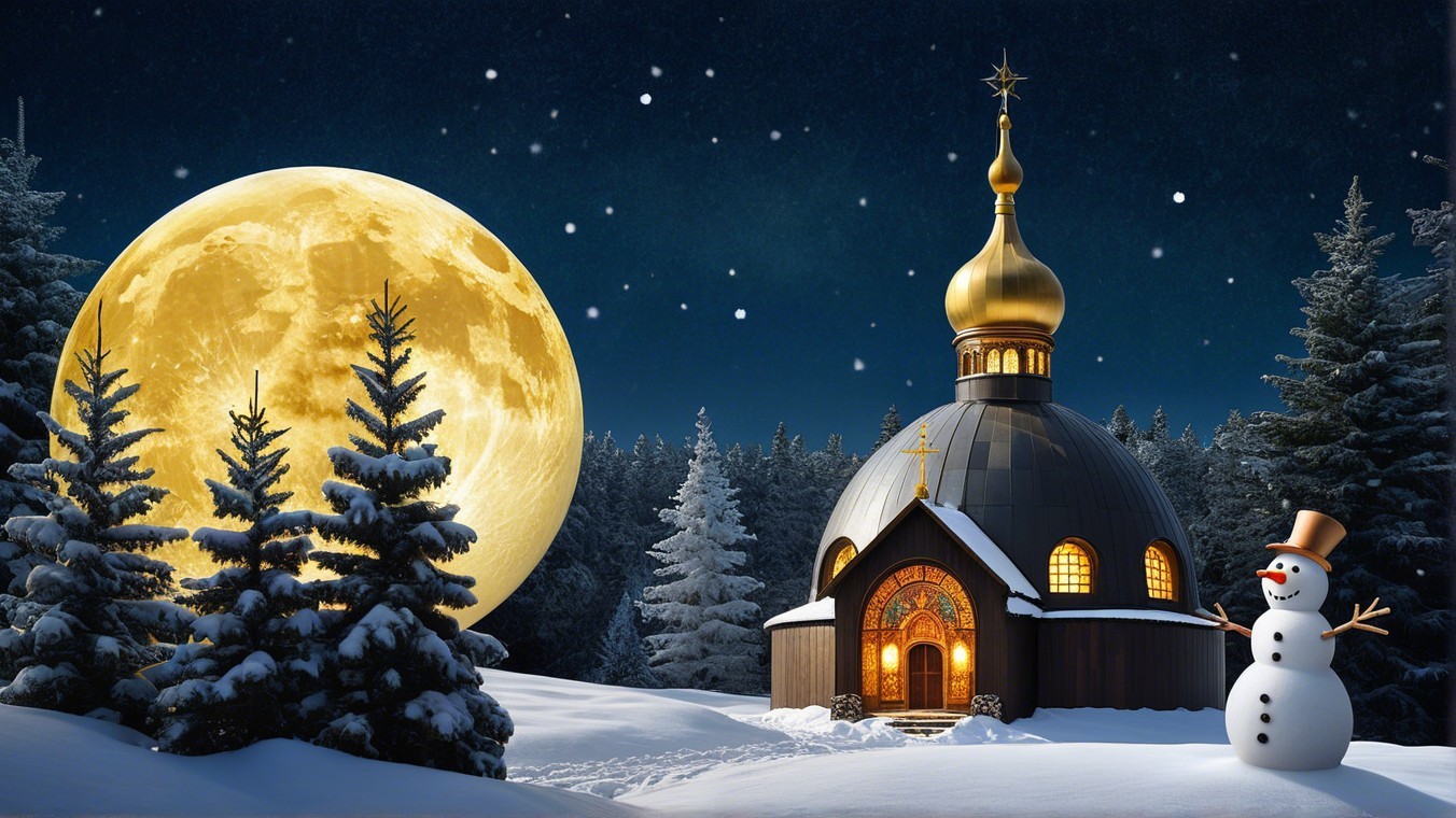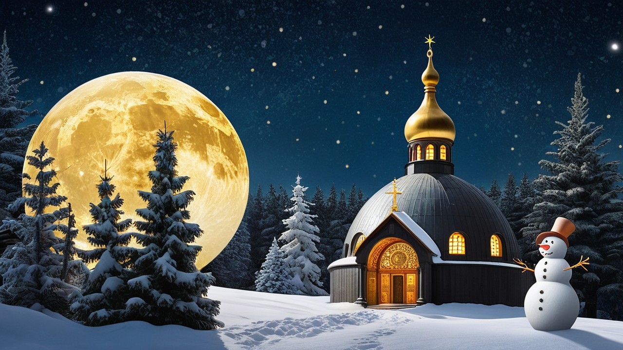 A snowy landscape features a wooden church with golden domes, illuminated warmly. A large moon shines above, and a cheerful snowman stands nearby, surrounded by tall, snow-covered trees.
