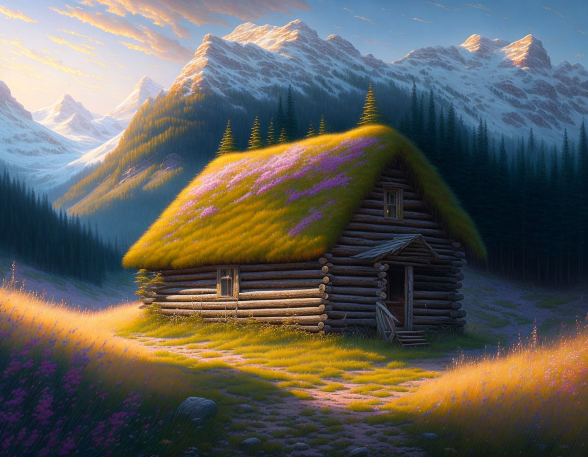 Rustic wooden cabin in flowery meadow with snowy mountains