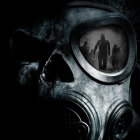 The image features a dark, atmospheric scene viewed through a gas mask visor, reflecting shadowy figures in protective gear marching forward, creating a sense of tension and foreboding.