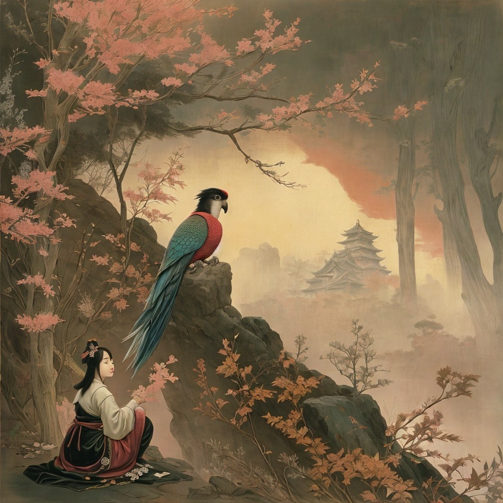 Legend of the Girl and the parrot, Medieval Japanese Artists Sumi-e Style, Velvet blush fuschia, sage, Shabby, Dull Gold, Amber Gray, marbled. dramatic