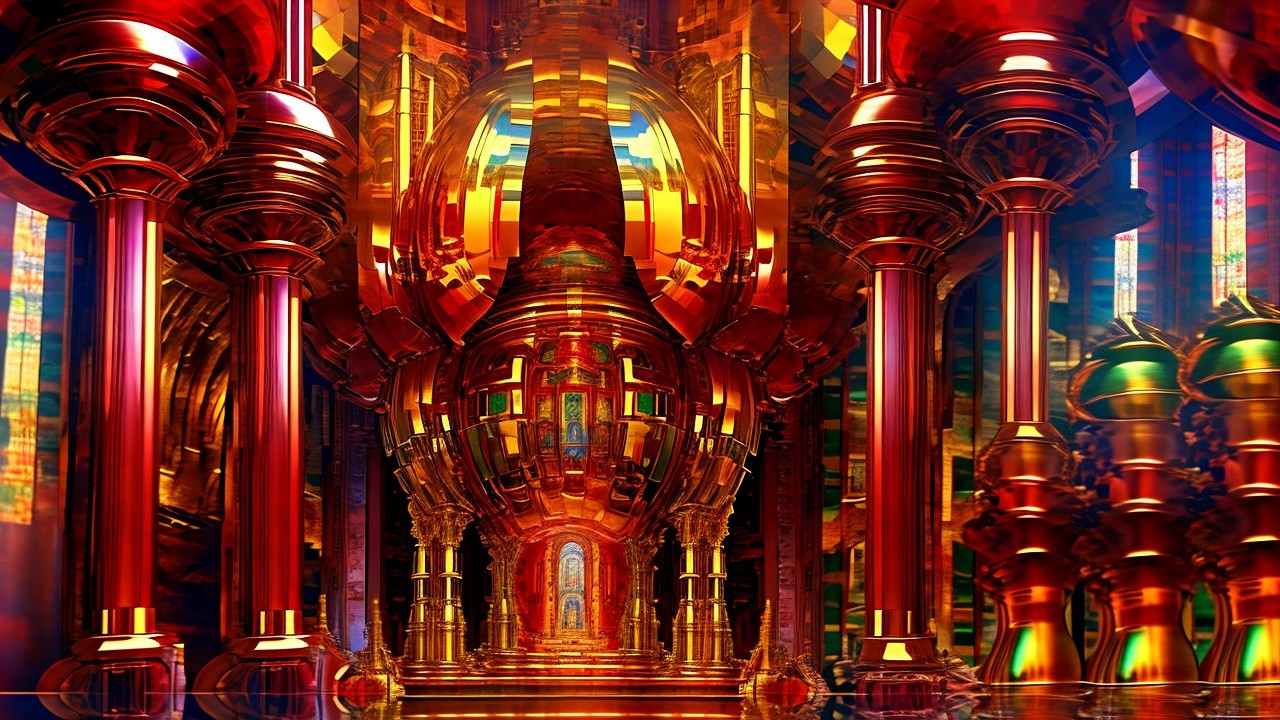 The image showcases a grand, futuristic interior adorned with ornate golden pillars and intricate architecture. Vibrant colors and intricate lighting create an ethereal atmosphere, emphasizing majestic details.