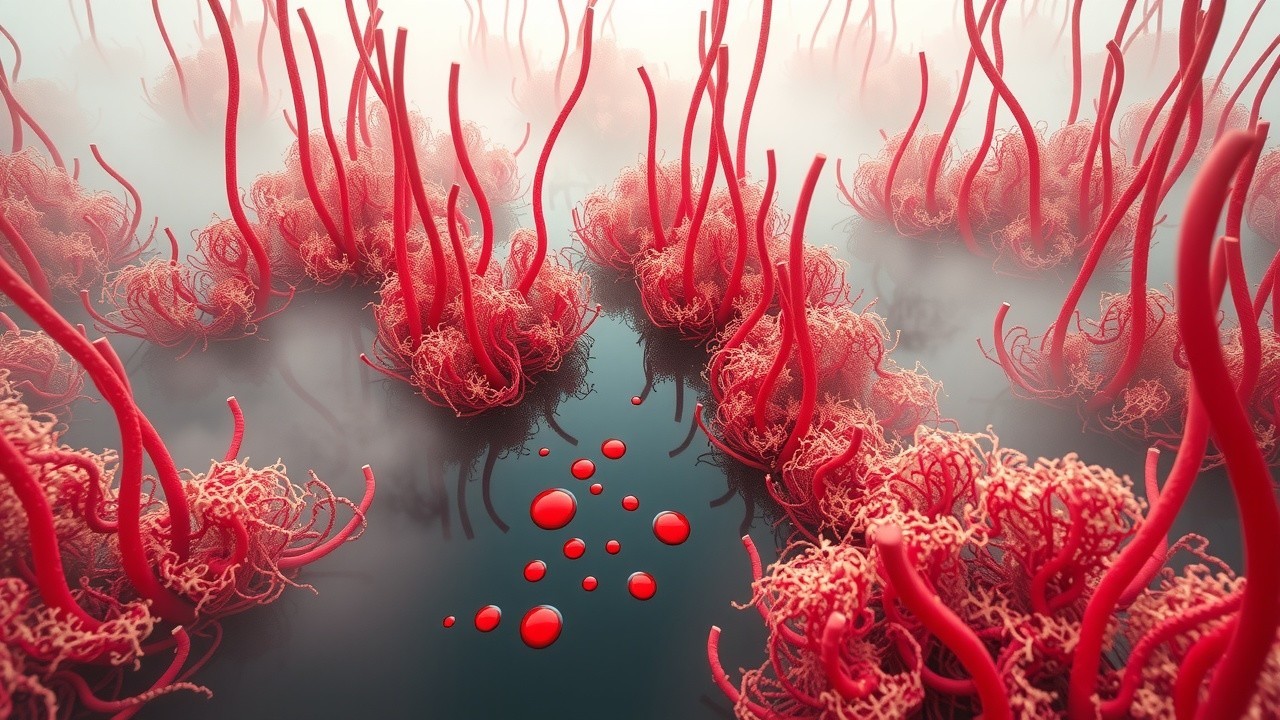 A surreal landscape features vivid red tendrils resembling roots or coral, swaying gently in a soft, hazy light. A dark reflective pool mirrors the colors, scattered with small red droplets, creating an ethereal atmosphere.