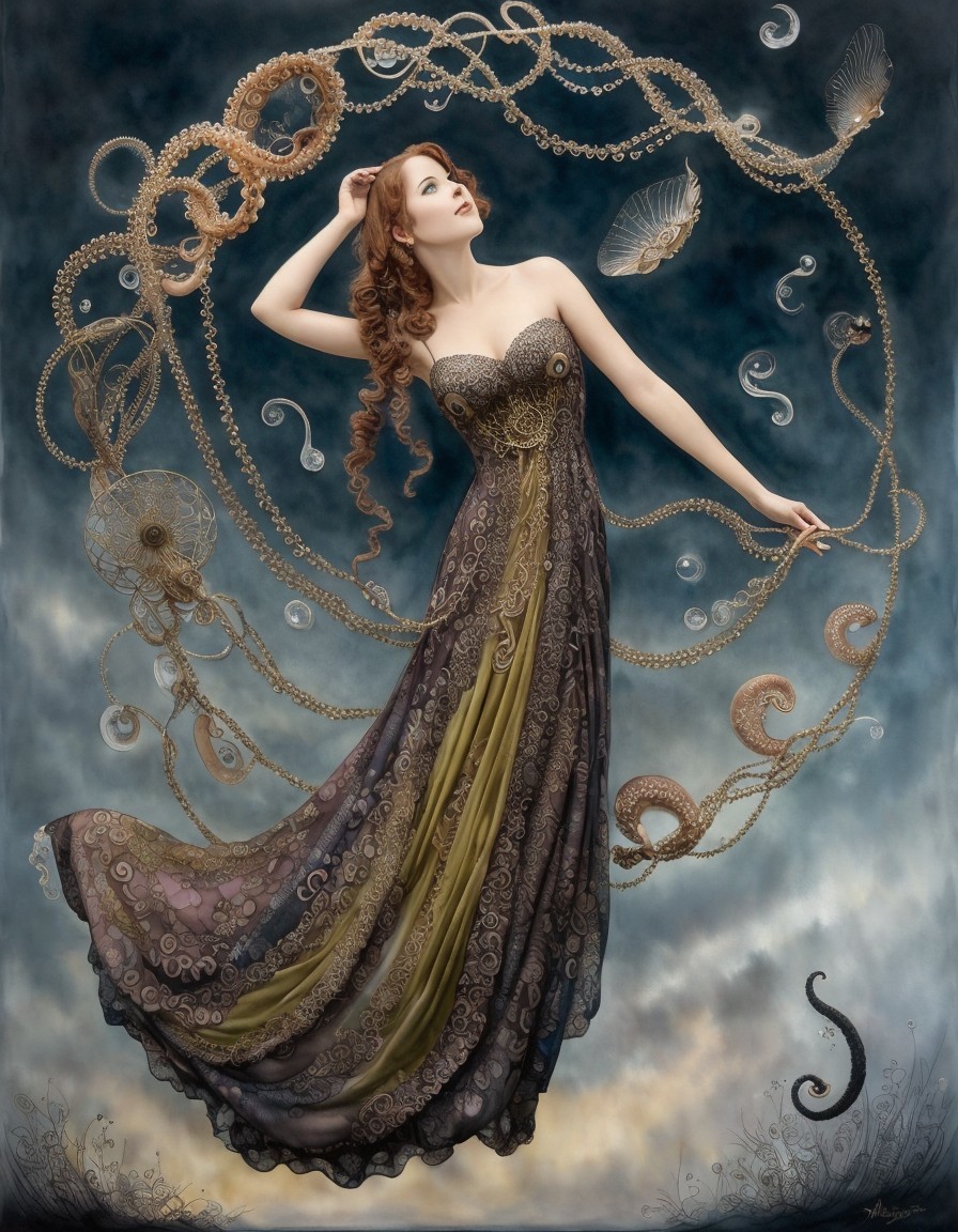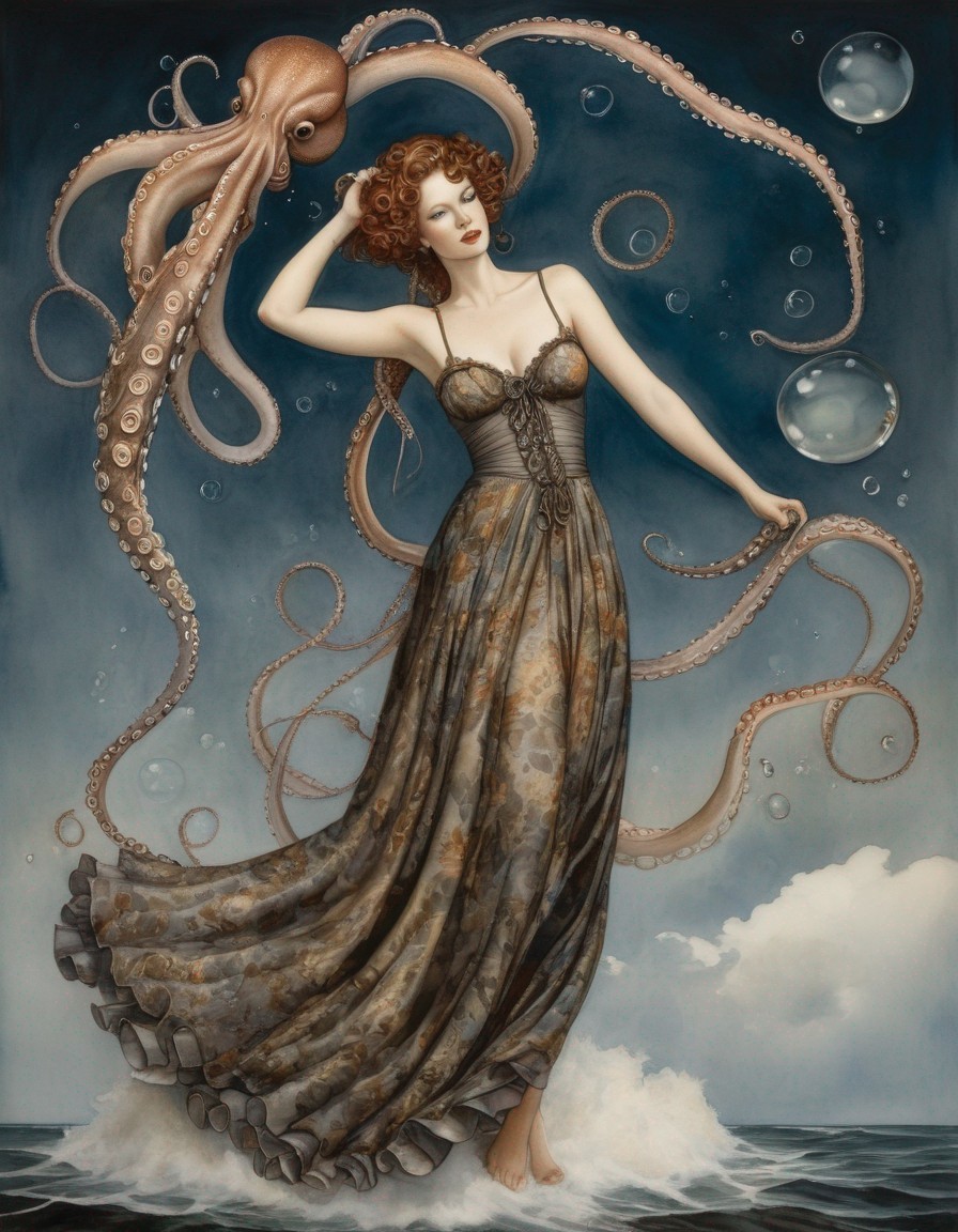A stylized illustration of a woman with octopus tentacles interacting with her hair, set against a sea backdrop, in a fantasy-themed art piece.