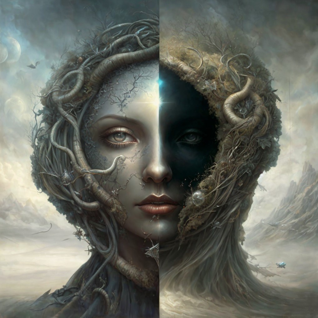 Dual Portrait of Woman with Light and Dark Themes