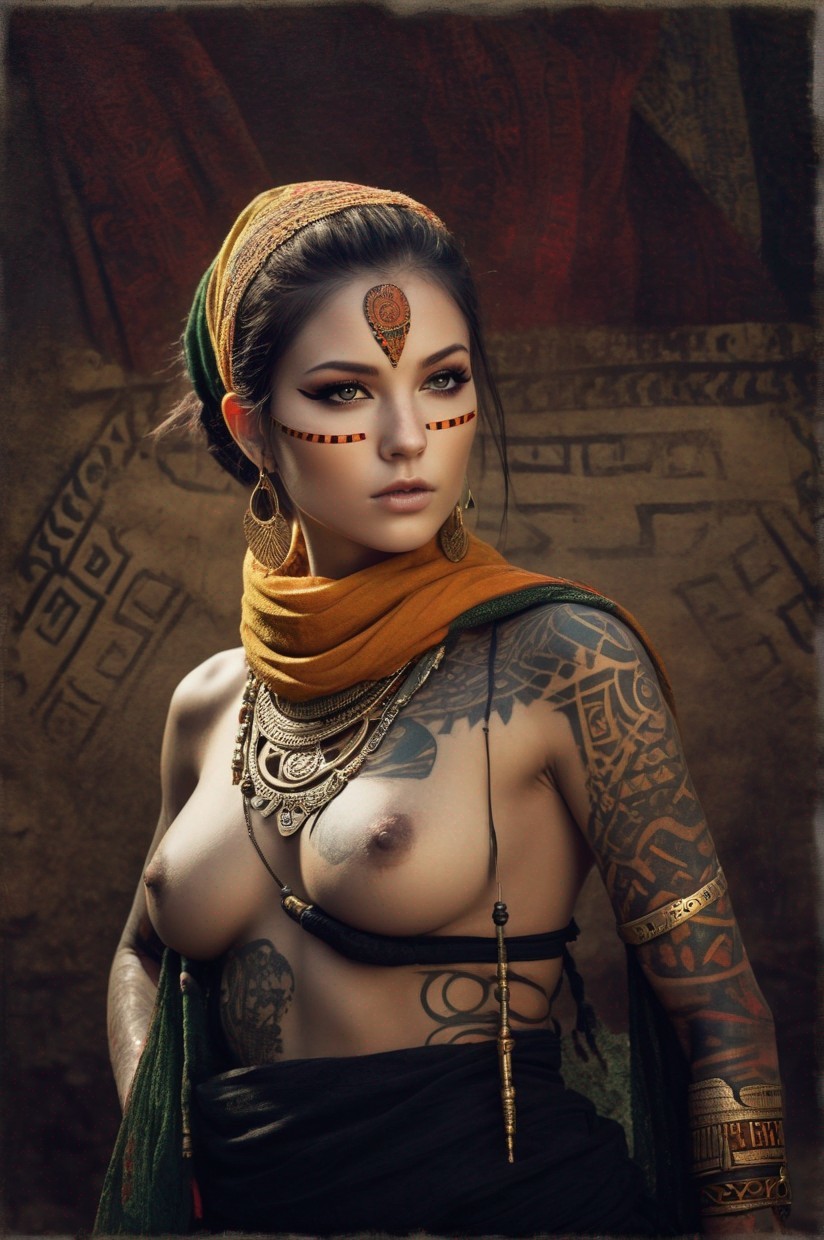 A woman with tribal face paint, green headscarf, and golden earrings stares forward, exuding a mystical aura.