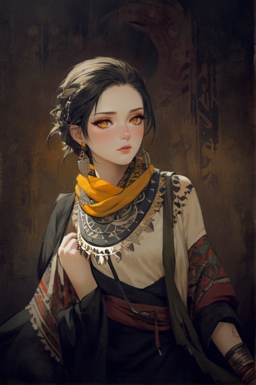 + Prompt:Masterpiece fantasy portrait, tribal-inspired features, orange reptilian eyes, intricate scale-like patterns, pale skin with freckles, tribal tattoo on nose bridge, weathered yellow mask with dark markings, gold, black, and red bead necklaces, rustic red and dark green scarf, serene expression, intense gaze, desaturated background, ancient script-covered fabric, hieroglyphs, grey eyes, shadowed hood, aged appearance, armor straps, rich color palette, mysterious gaze, detailed illustration, by Gobi, Artstation.